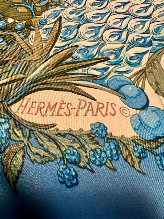 Hermès Vintage Tuch „Perroquets et Fruits“ 1972 – François Faconnable, Seide, Papageien blau