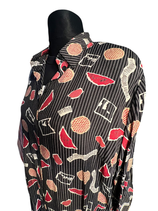 Vintage 80s/90s Oversize Bluse Rio Gr. 48 | Schwarz Grau Rot | Viskose | Statement Pattern