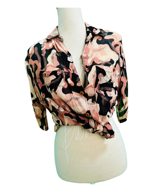 Vintage Viskose Bluse M Camouflage beige braun leicht transparent