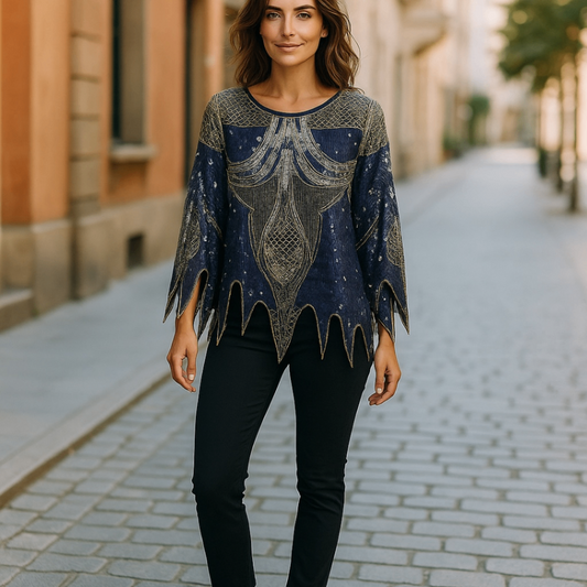 True Vintage Le Beau 80s Blusentop 40/42 Blau Pailletten