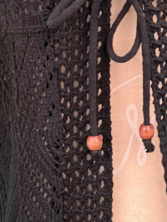 Vintage Impulse London Strickjacke XL , passt ca bis Gr. 48 Schwarz mit Lockstrickmuster, vorne Band zum binden mit Holzperlen