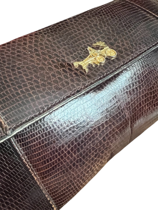 Vintage 80s J. Perez Clutch | Braun Schlangenleder mit gold Kutsche Emblem | Elegante Statement Bag