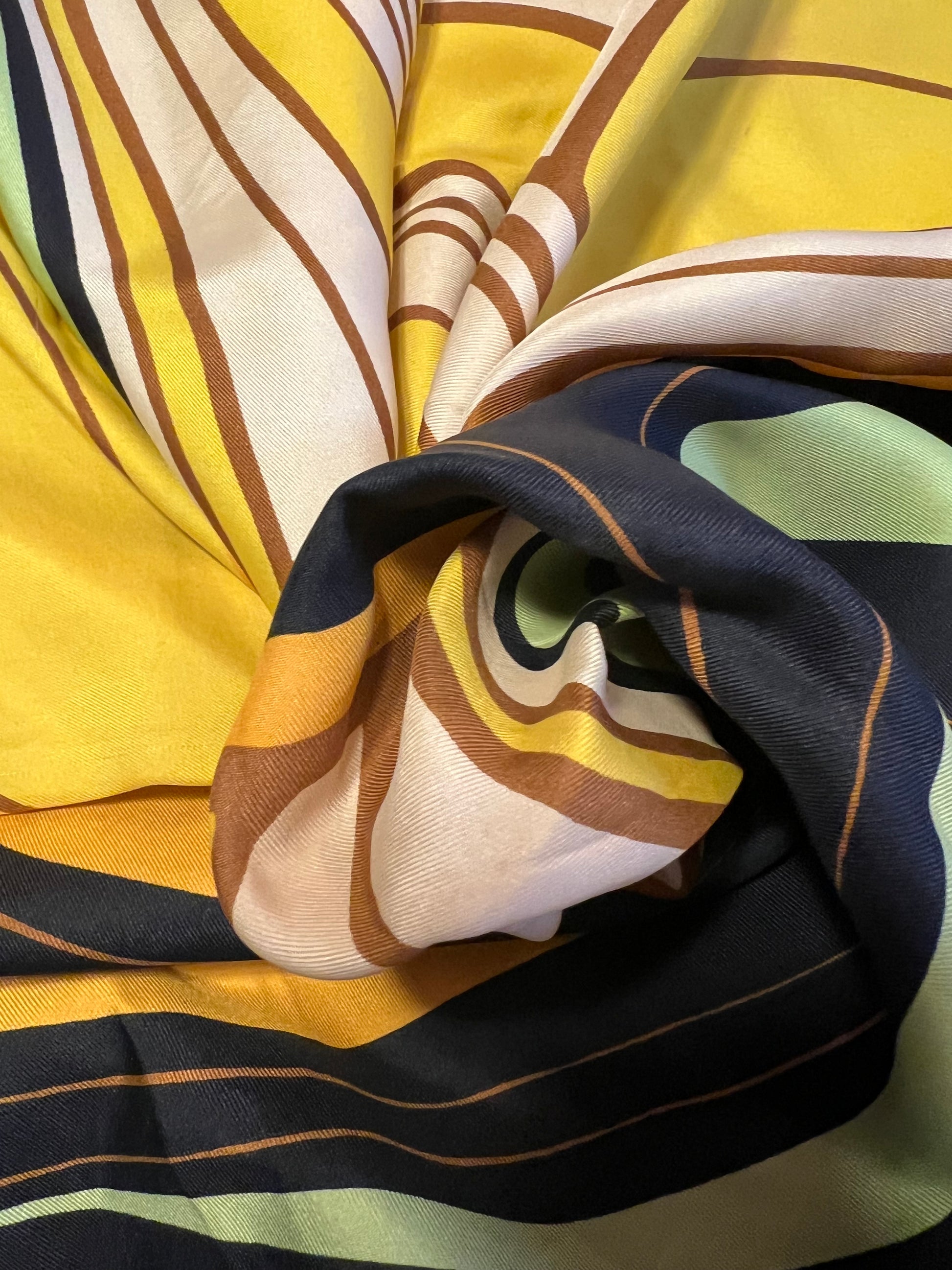 Das Materialetikett ist nicht mehr vorhanden – bei Vintage-Tüchern dieser Zeit aber sehr üblich. Griff, Glanz und Fall sprechen stark für reine Seide. Die offenen, nicht versäuberten Kanten sind original und absichtlich so gefertigt, ein bekanntes Merkmal früher Designer-Seidentücher.👍🏻
