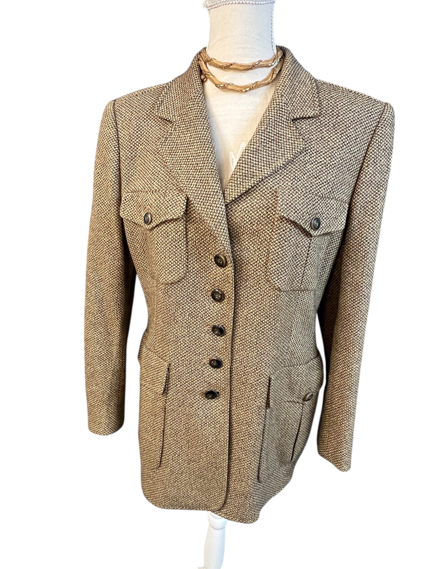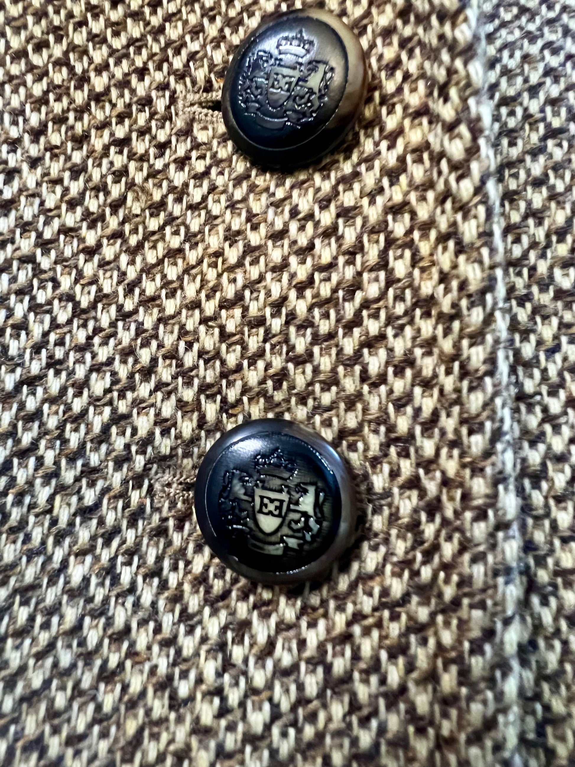 Der Blazer überzeugt durch seinen edlen braun-beigen Strukturstoff, eine taillierte Silhouette, breite Schulterpartie (sehr gefragt im aktuellen Quiet Luxury & Old Money Trend) sowie besondere schwarz-beige Knöpfe mit geprägtem ESCADA Logo.
