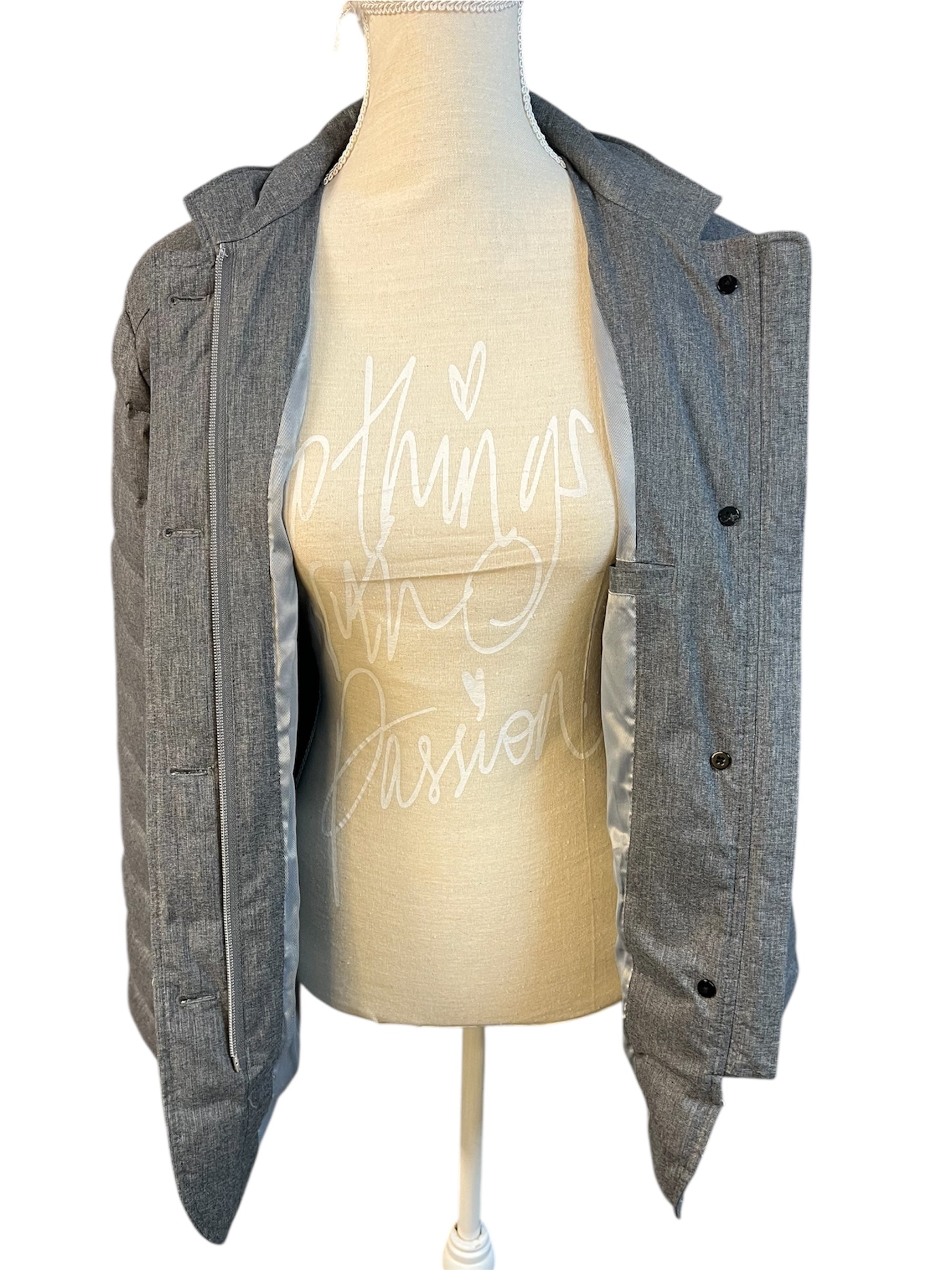 Die Jacke kommt in einem eleganten graumelierten, matten Look mit moderner Stoffoptik.