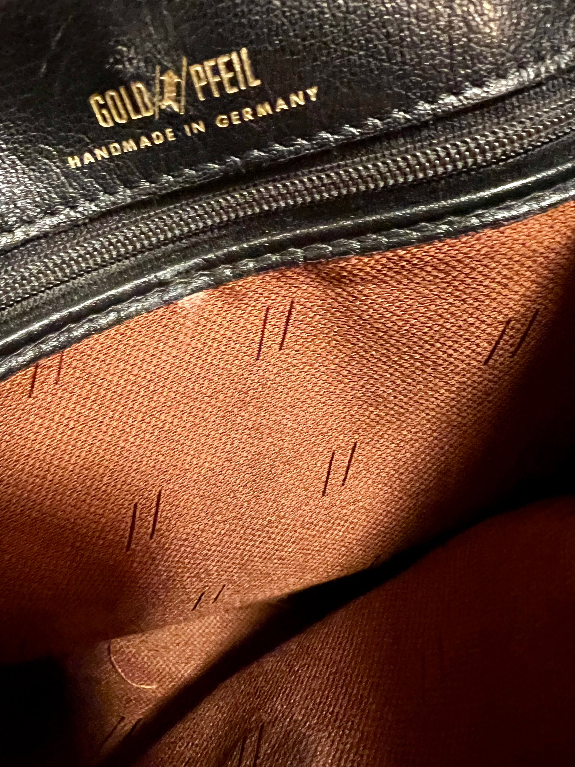 Goldpfeil Vintage Ledertasche Schwarz – Handmade in Germany, Gold‑Hardware, Top Zustand