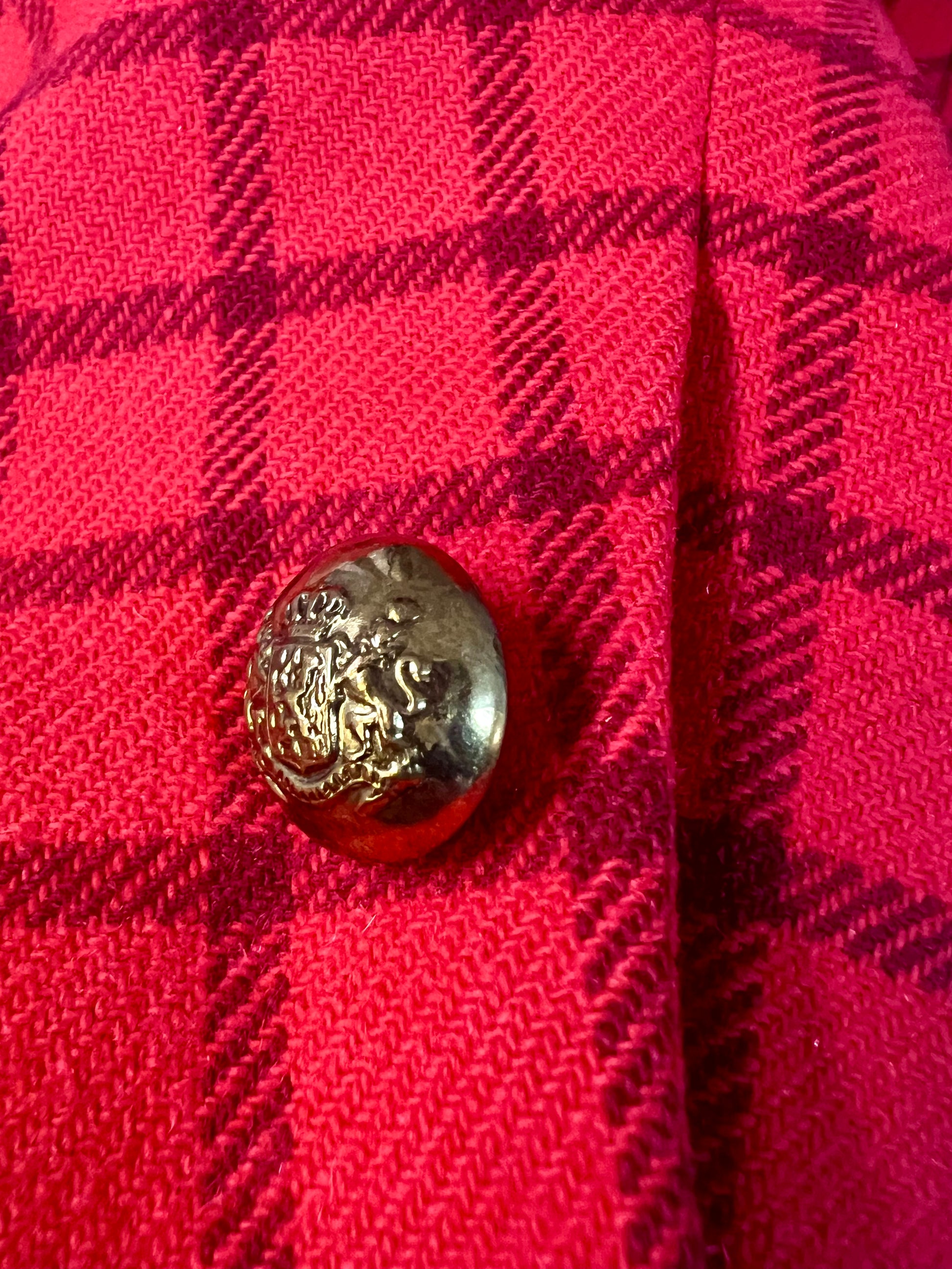 🔥 Highlight: Klassisches kariertes Rot mit dunklerem Rot-Karomuster und markanten goldenen Knöpfen mit Wappenmotiv – ein echtes Statement-Piece für deinen Kleiderschrank.
