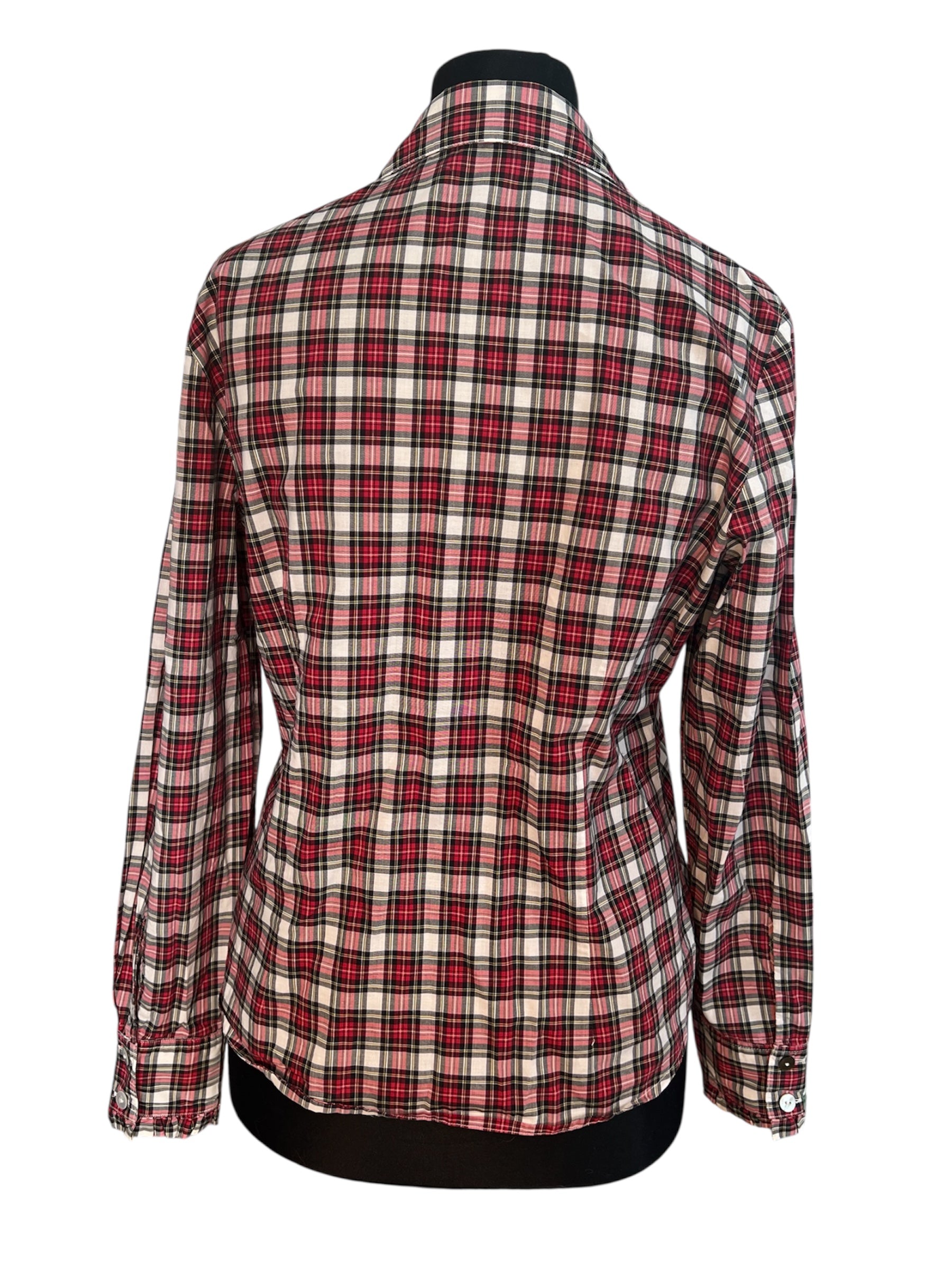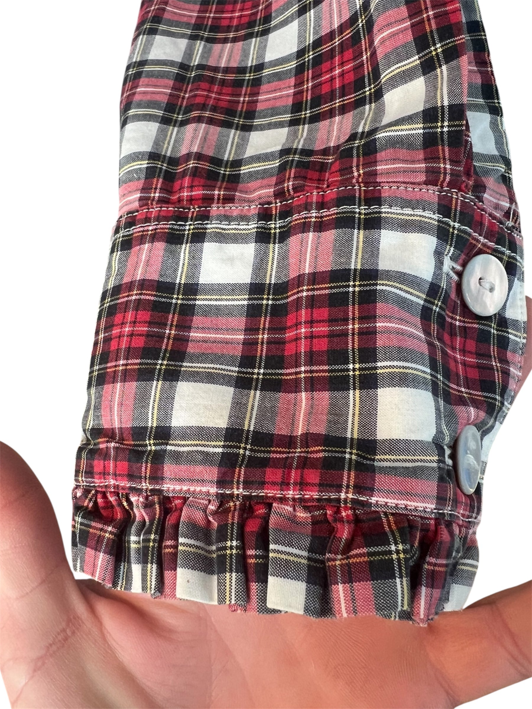 Diese Vintage Bluse von B.M. Company (Gr. 38) ist ein Must-Have für Dark Academic, Preppy und Retro-Looks. Schottisches Karo in Rot, Schwarz und Weiß, Rüschen am Verschluss bis zur Taille und dezente Falten am Ärmelabschluss verleihen ihr intellektuellen Charme und romantische Note.