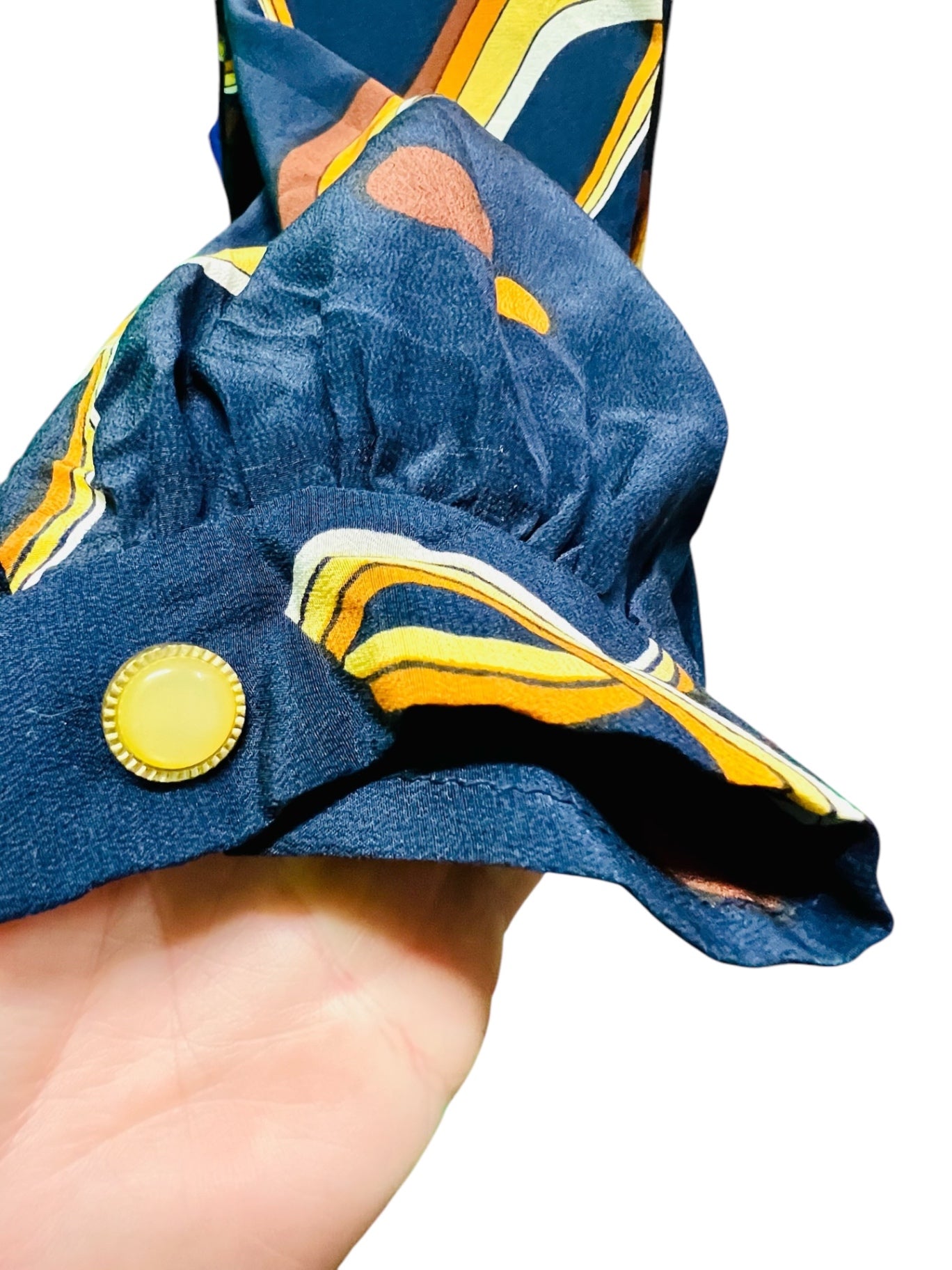 Dieses atemberaubende Original Handmade Vintage 70er Jahre Kleid in Blau mit einem lebendigen Muster in Orange und Gelb ist ein absolutes Unikat. So ein Kleid findest du nicht so schnell nochmal.