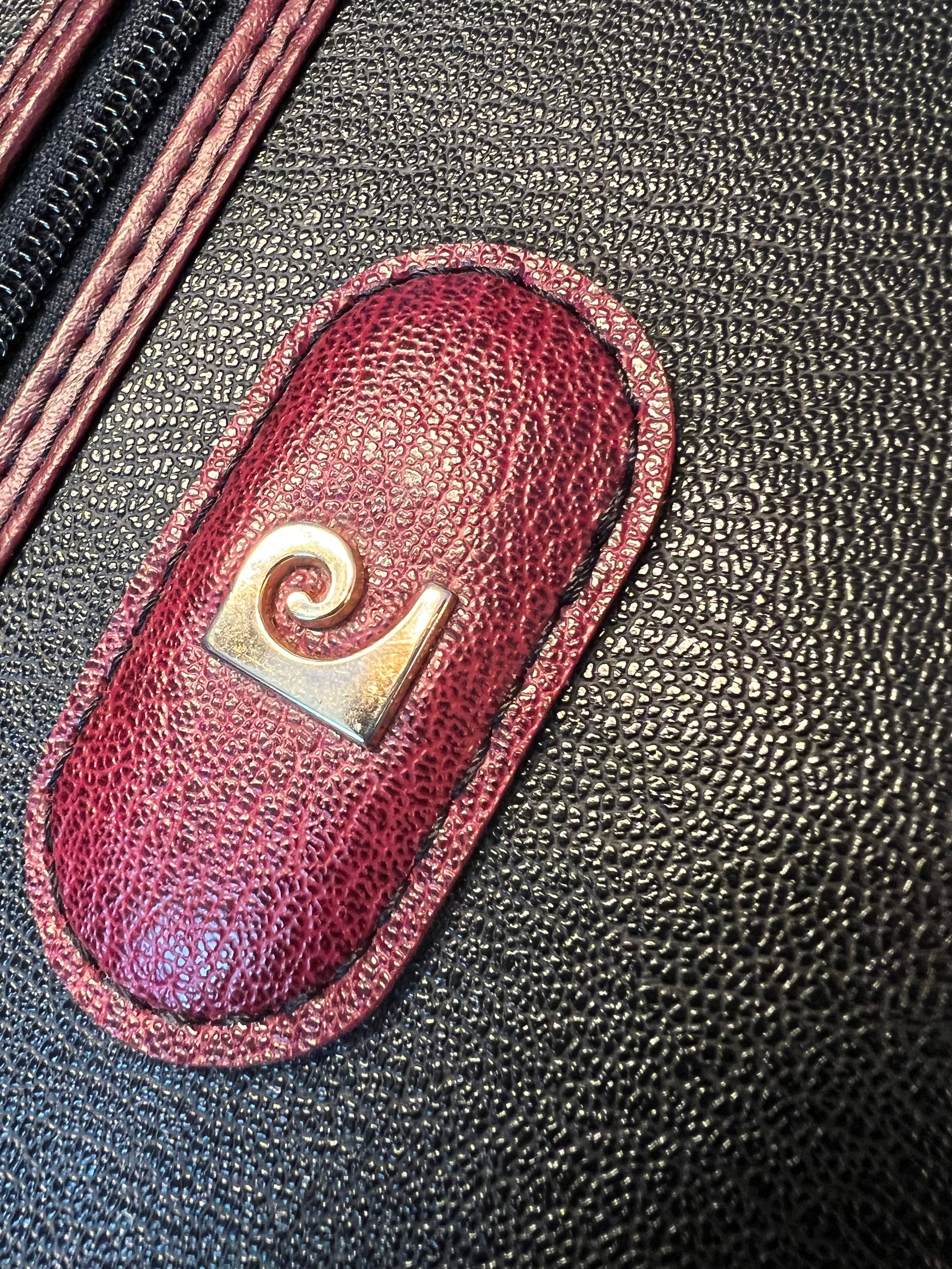 Vorne mit goldenem Metall Logo sowie Pierre Cardin Schriftzug in Gold auf Leder ein markantes Branding mit eleganter Ausstrahlung