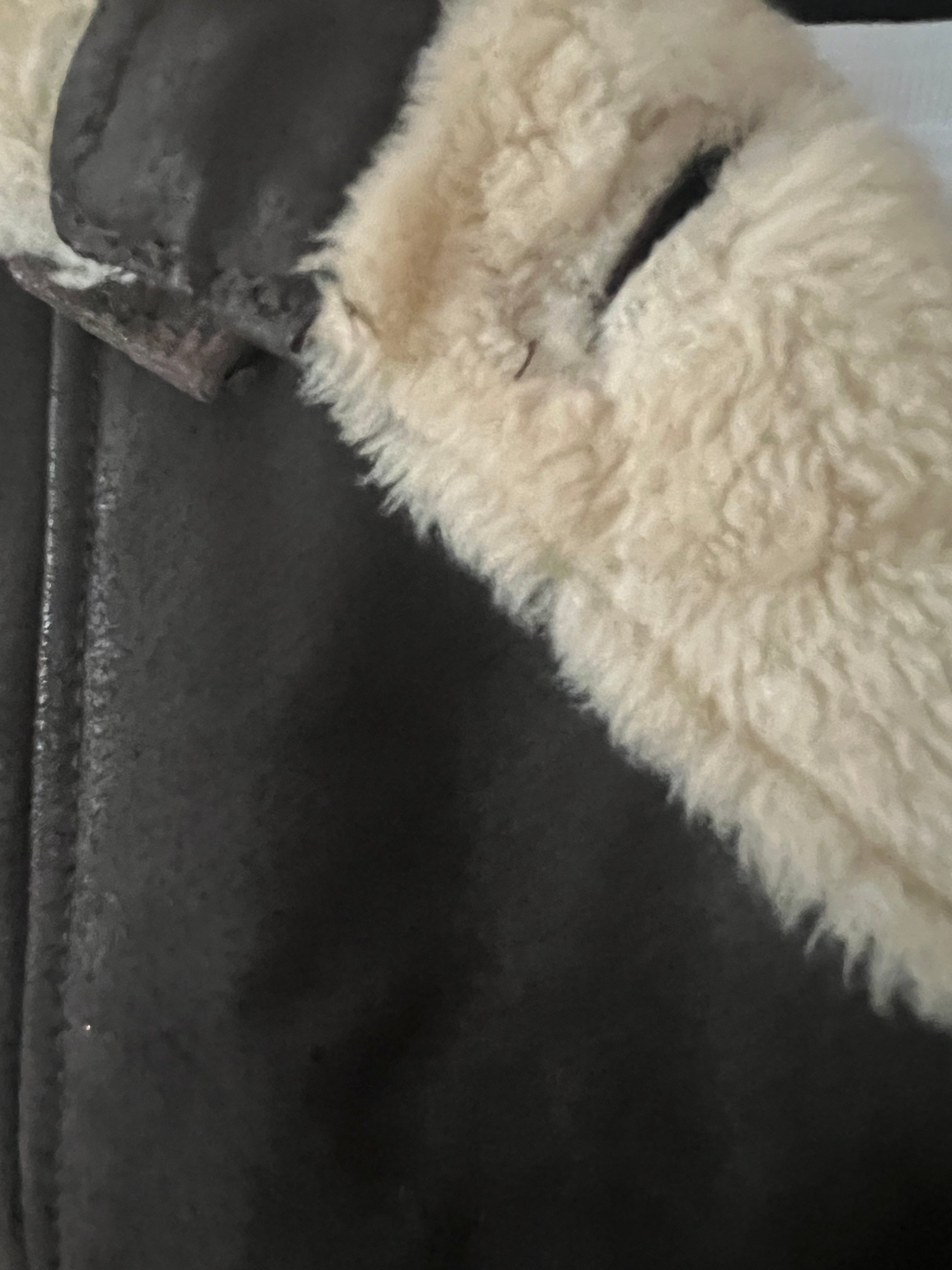 Die Jacke hat einen markanten, warmbeigen Teddyfell-Kragen (Polyester), der sich auch an den Ärmelabschlüssen und am Saum wiederfindet – super kuschelig und gleichzeitig stylisch.