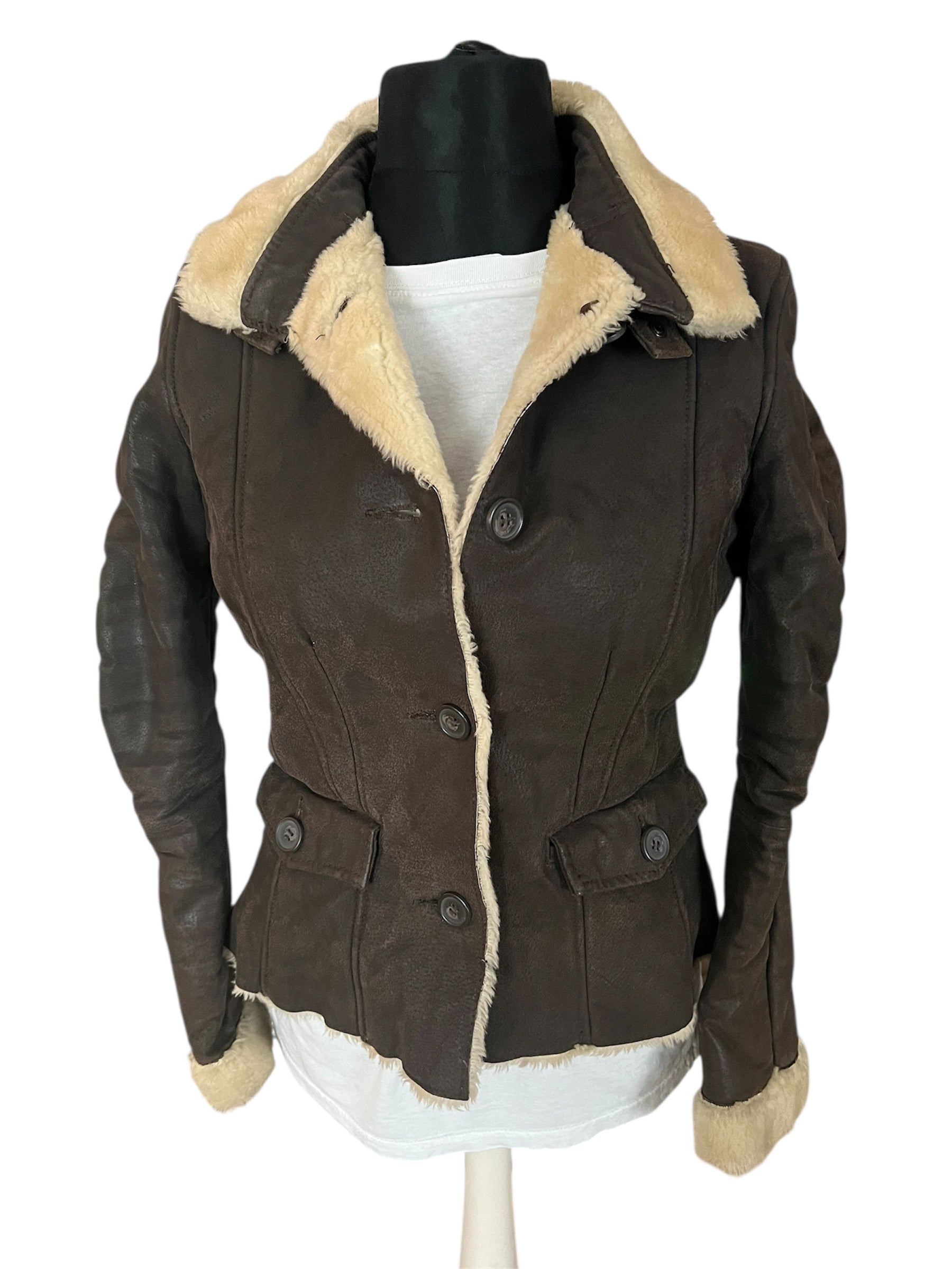 True Vintage Lederjacke XS/34 Braun Teddyfell Pilotenjacke Made in Italy 80s