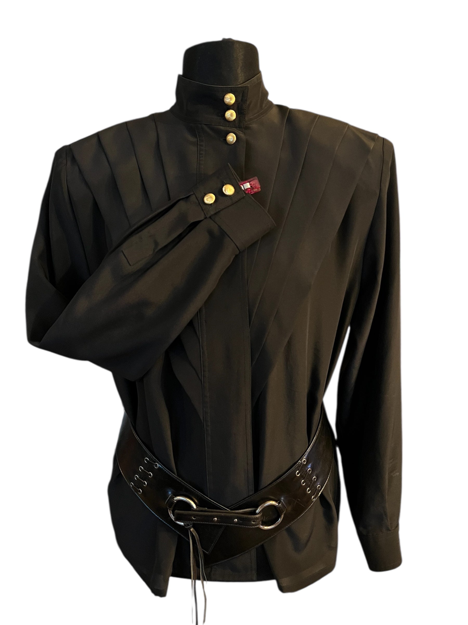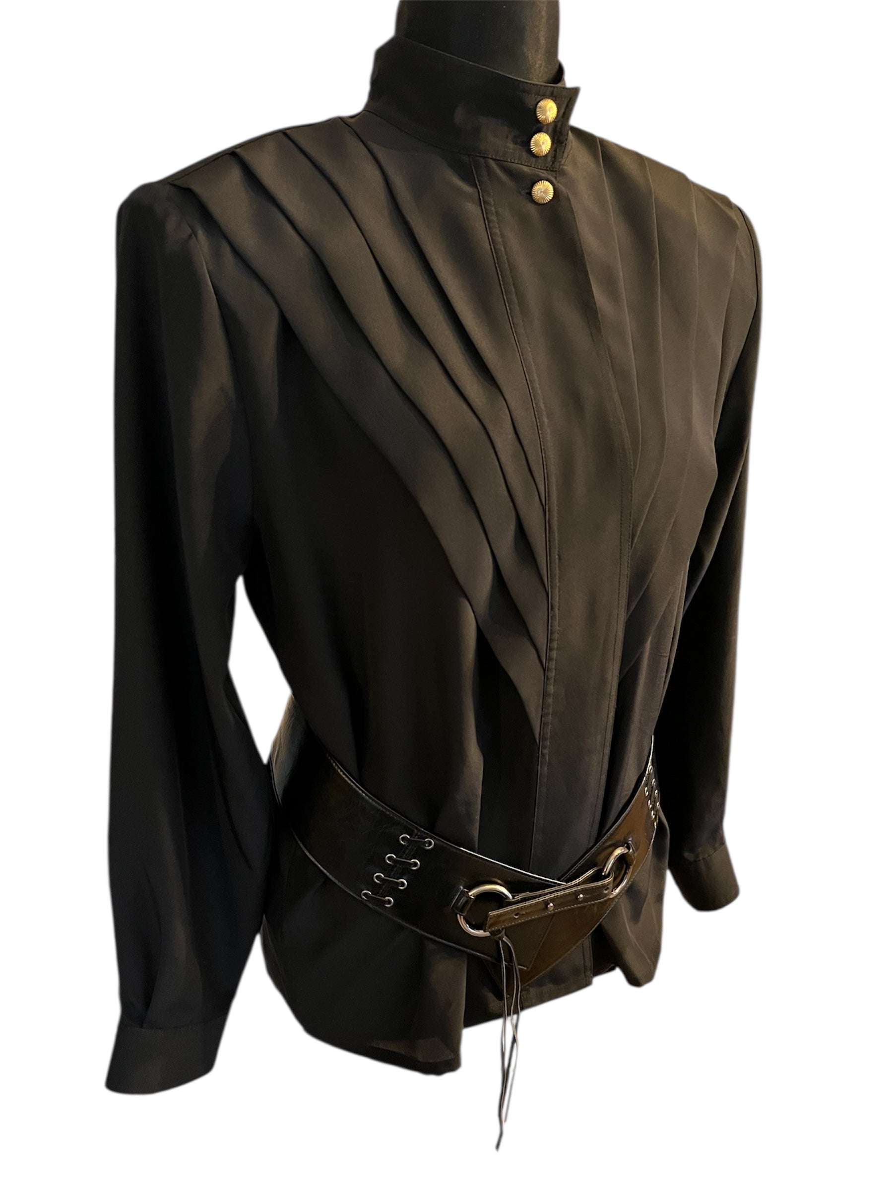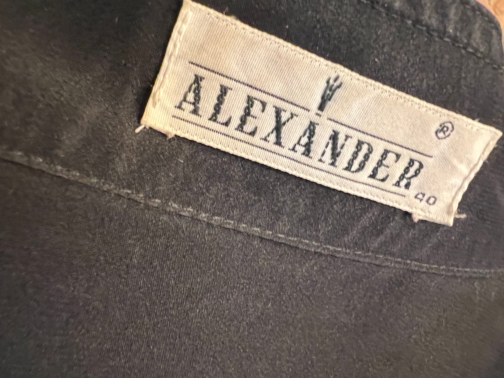 Seltene Vintage Bluse der Marke Alexander aus den 80ern – ein echtes Statement-Piece für alle Liebhaber:innen von Dark Fashion, Matrix-Vibes oder Dark Academia Looks. 🖤