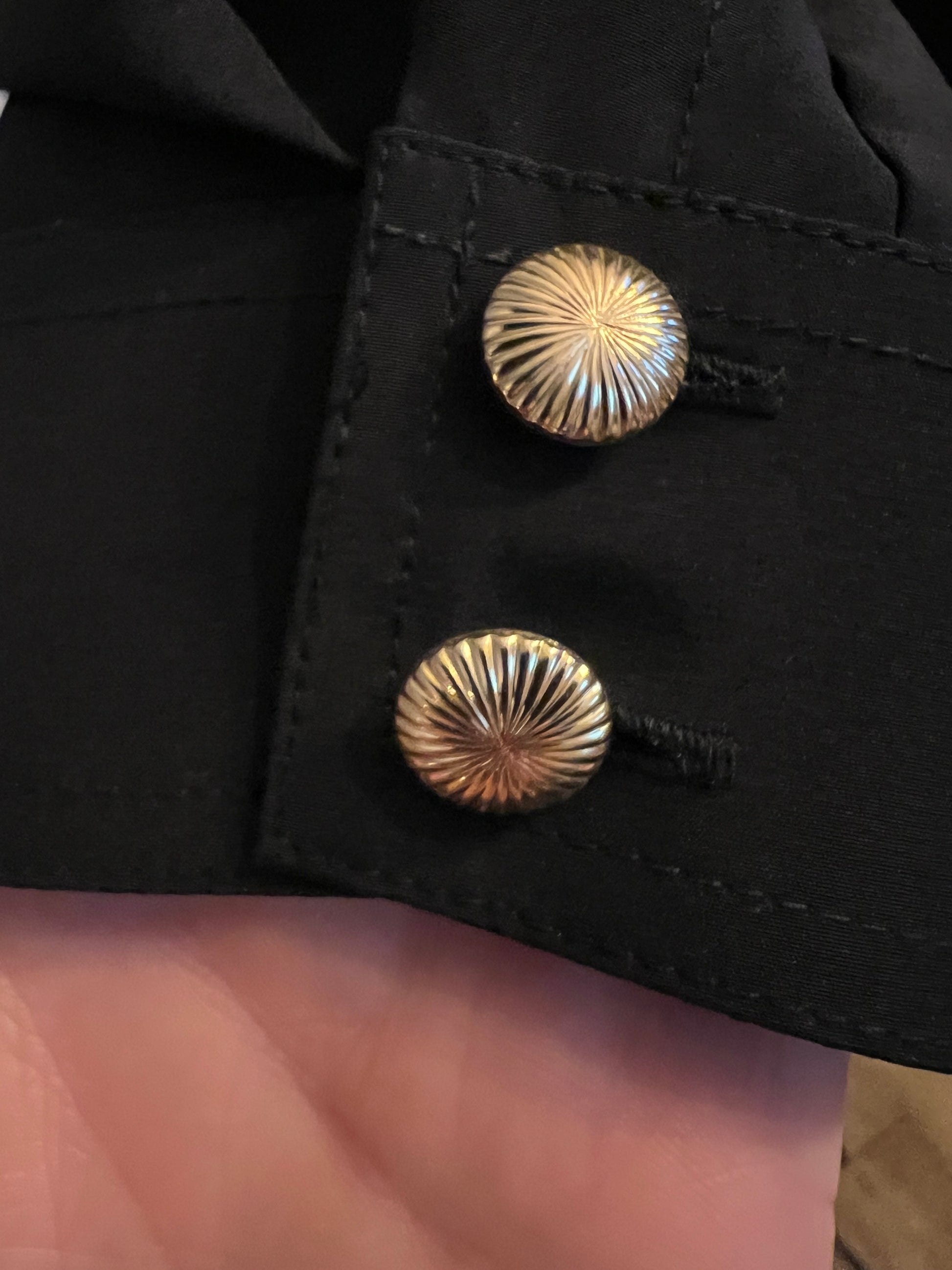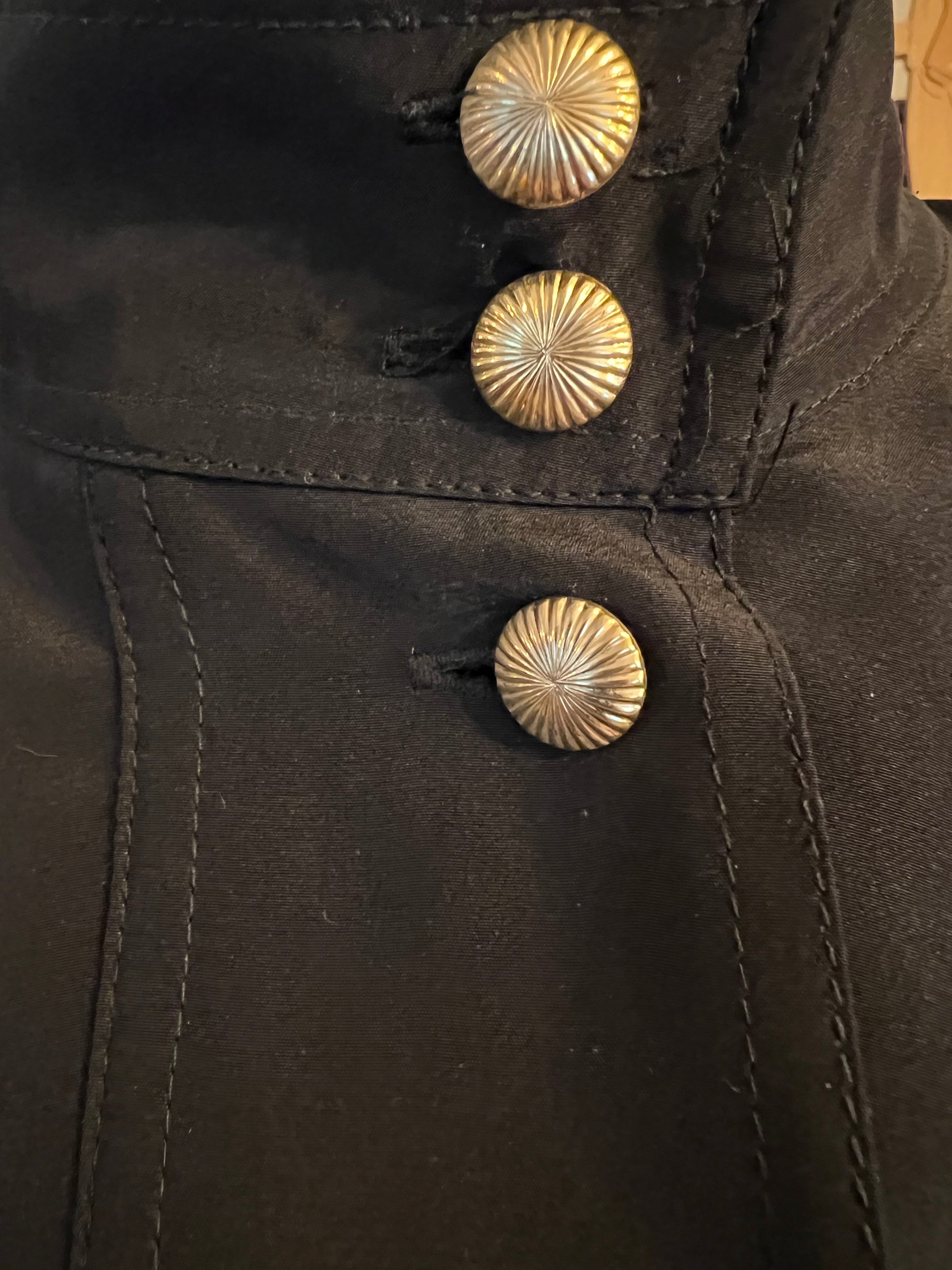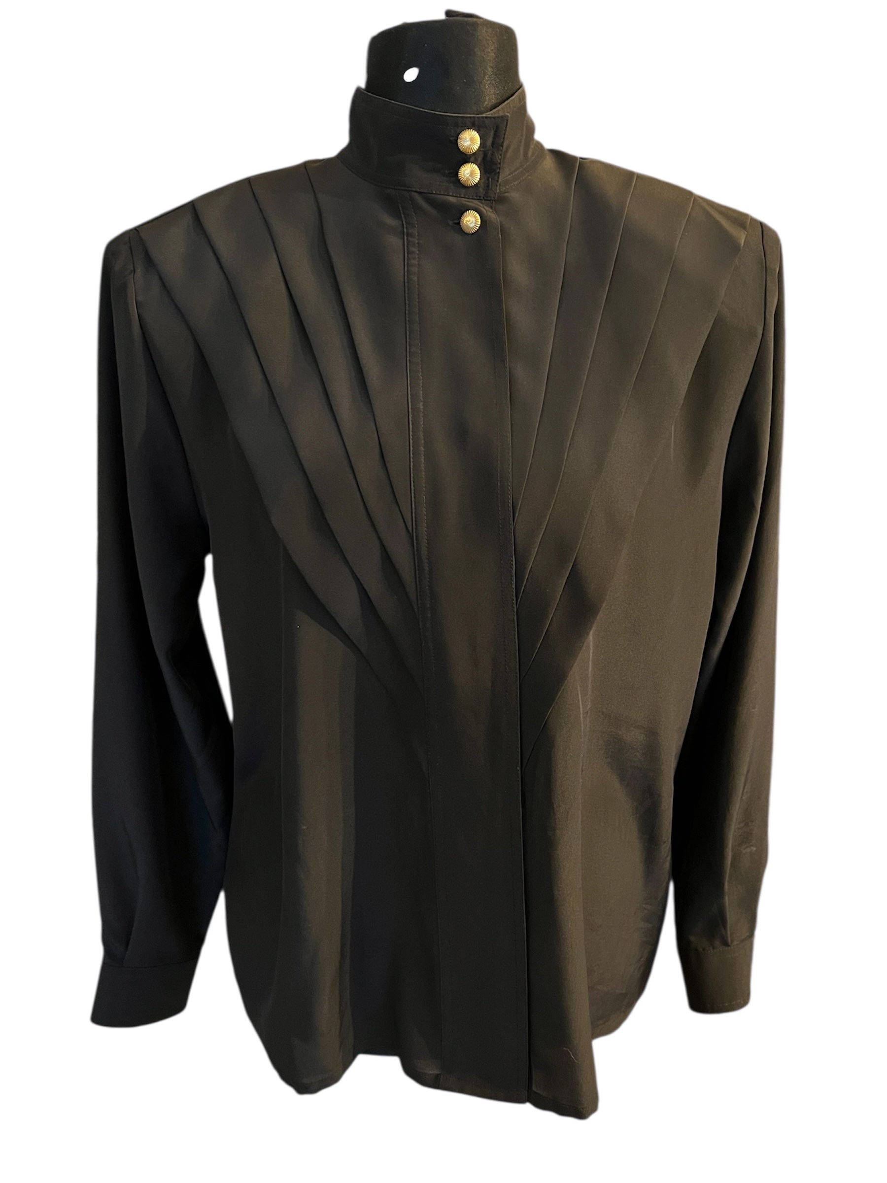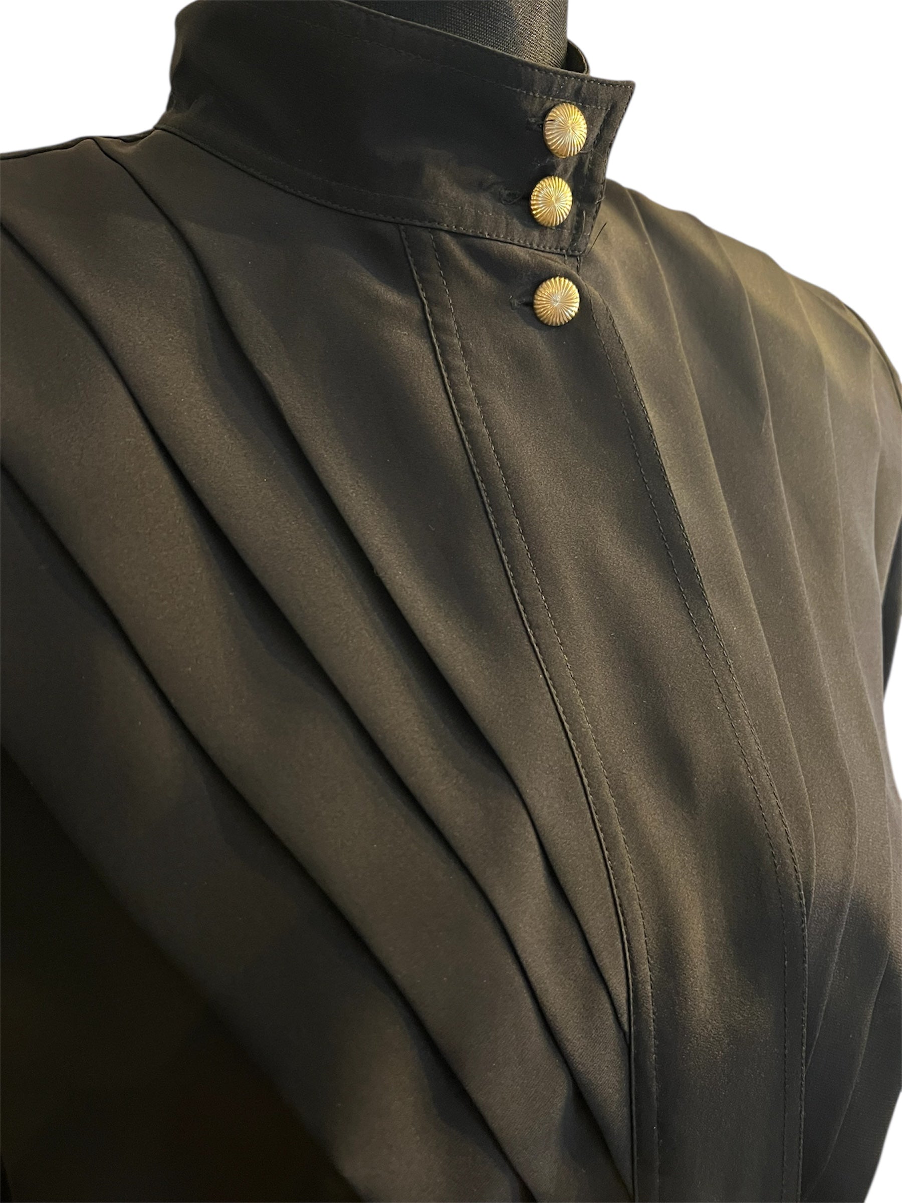 Die schwarze Bluse ist hochgeschlossen wie ein Rollkragen, aber ohne klassischen Kragen – stattdessen ein edler Abschluss mit drei goldenen Knöpfen am Hals. Auf der Vorderseite verlaufen elegante V-förmige Falten, die für einen schmeichelhaften und strukturierten Look sorgen. Die Rückseite ist clean gehalten. Verdeckte Knopfleiste unter den Falten.