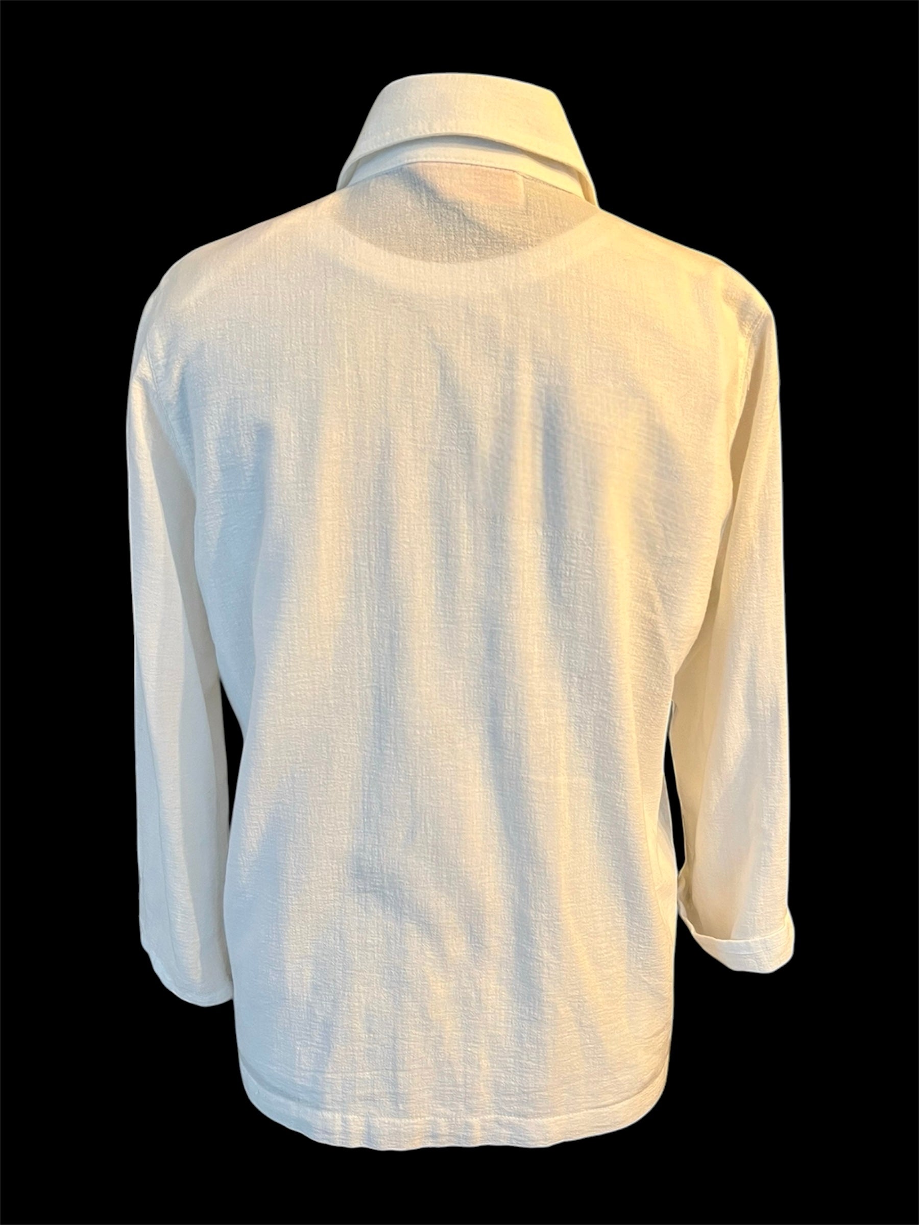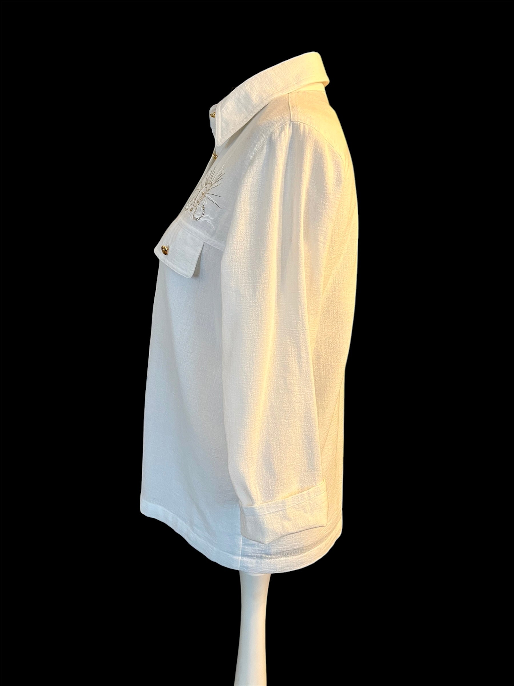 Vintage Avantgarde Bluse M 38/40 Weiß Gold Leinenmix – Boho Chic Mystic Sun Embroidery