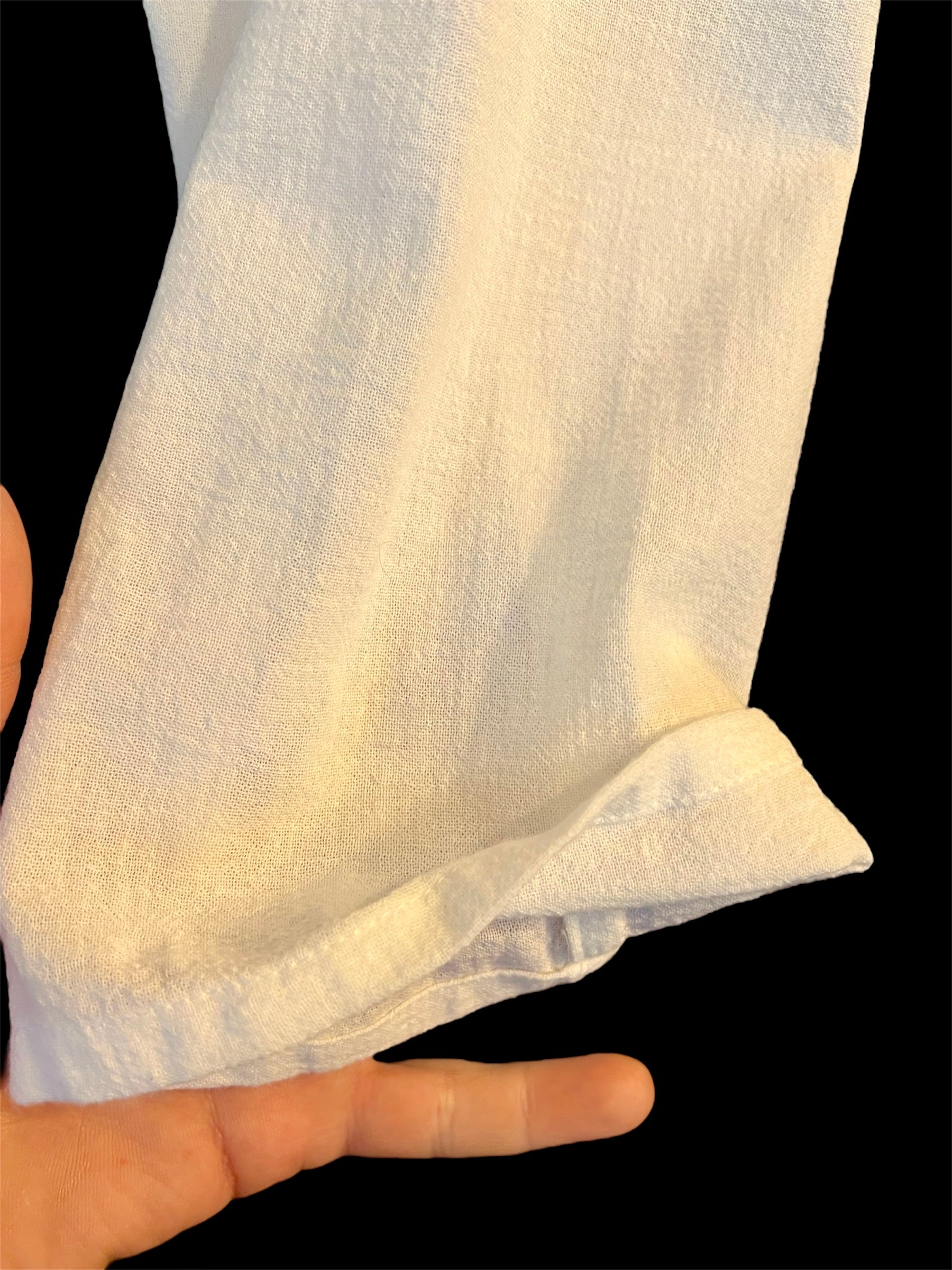 Wunderschöne weiße Bluse aus einem hochwertigen Stoff, vermutlich Leinen-Baumwoll-Mix – leicht durchscheinend, super angenehm auf der Haut und locker geschnitten.