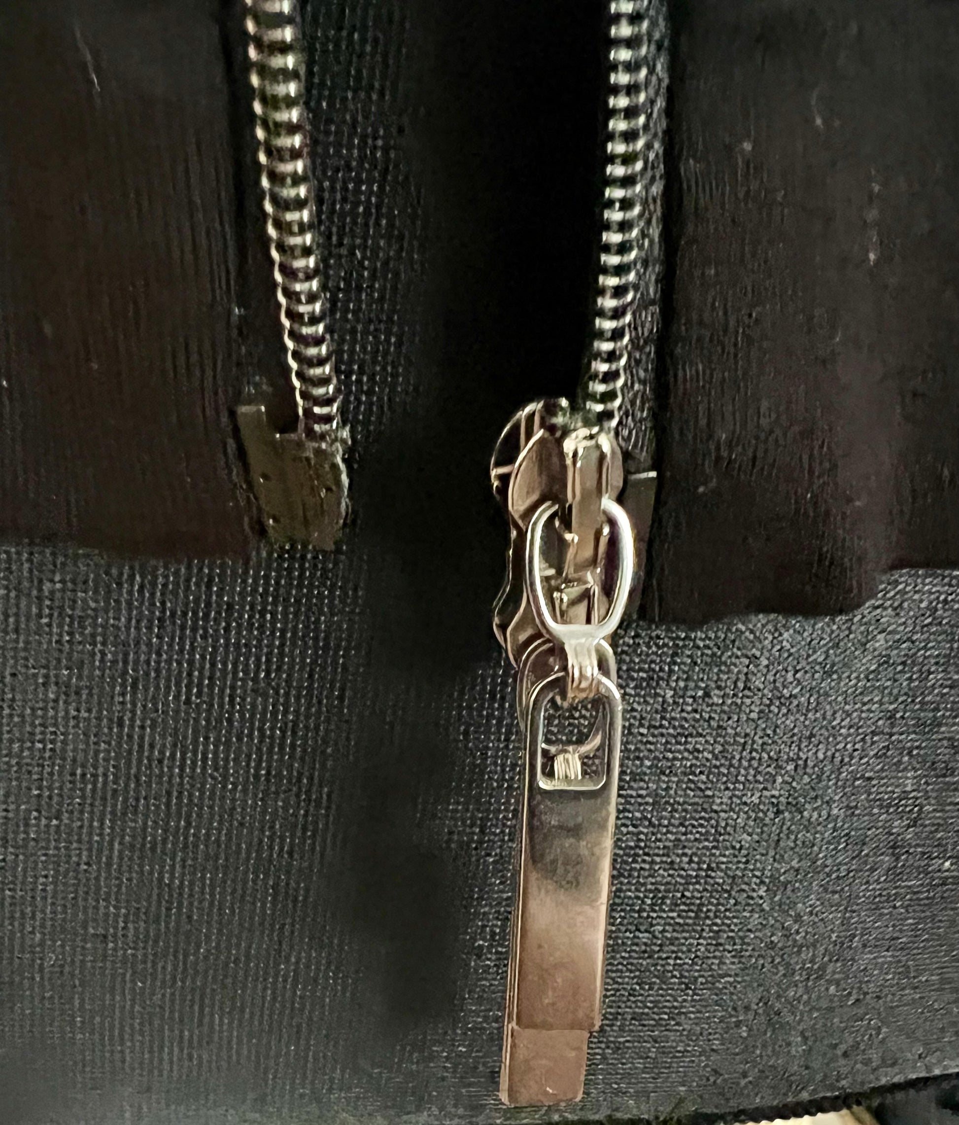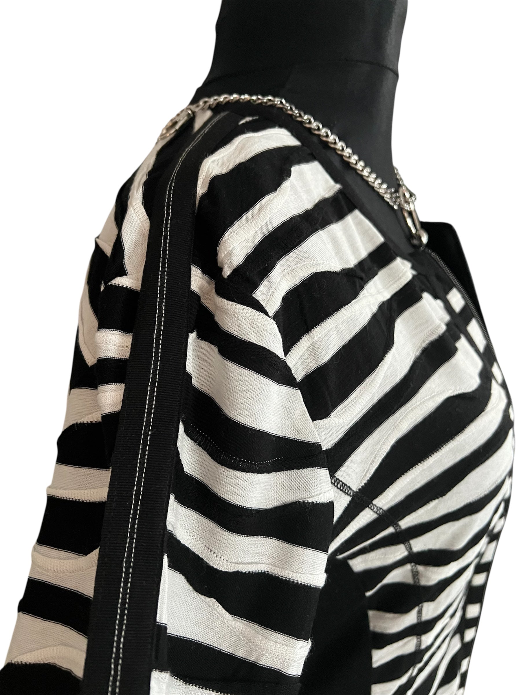 Der Grundstoff ist tiefschwarz, darüber sind weiße Stoffapplikationen mit offenen Kanten in welligen Querstreifen – ein Look, der an ein dezentes Zebra-Muster erinnert und für coole Textur sorgt.