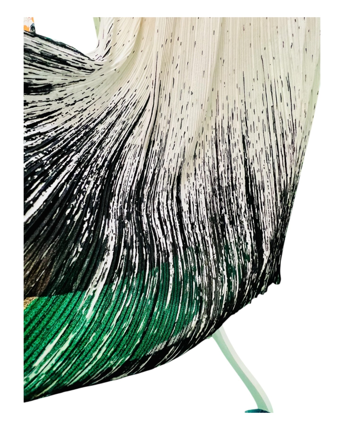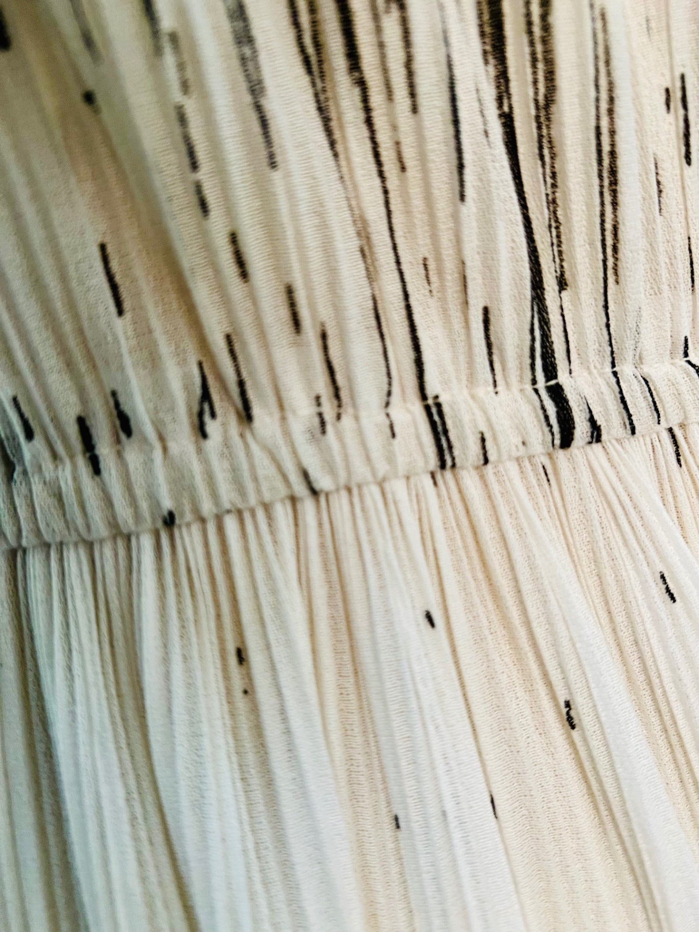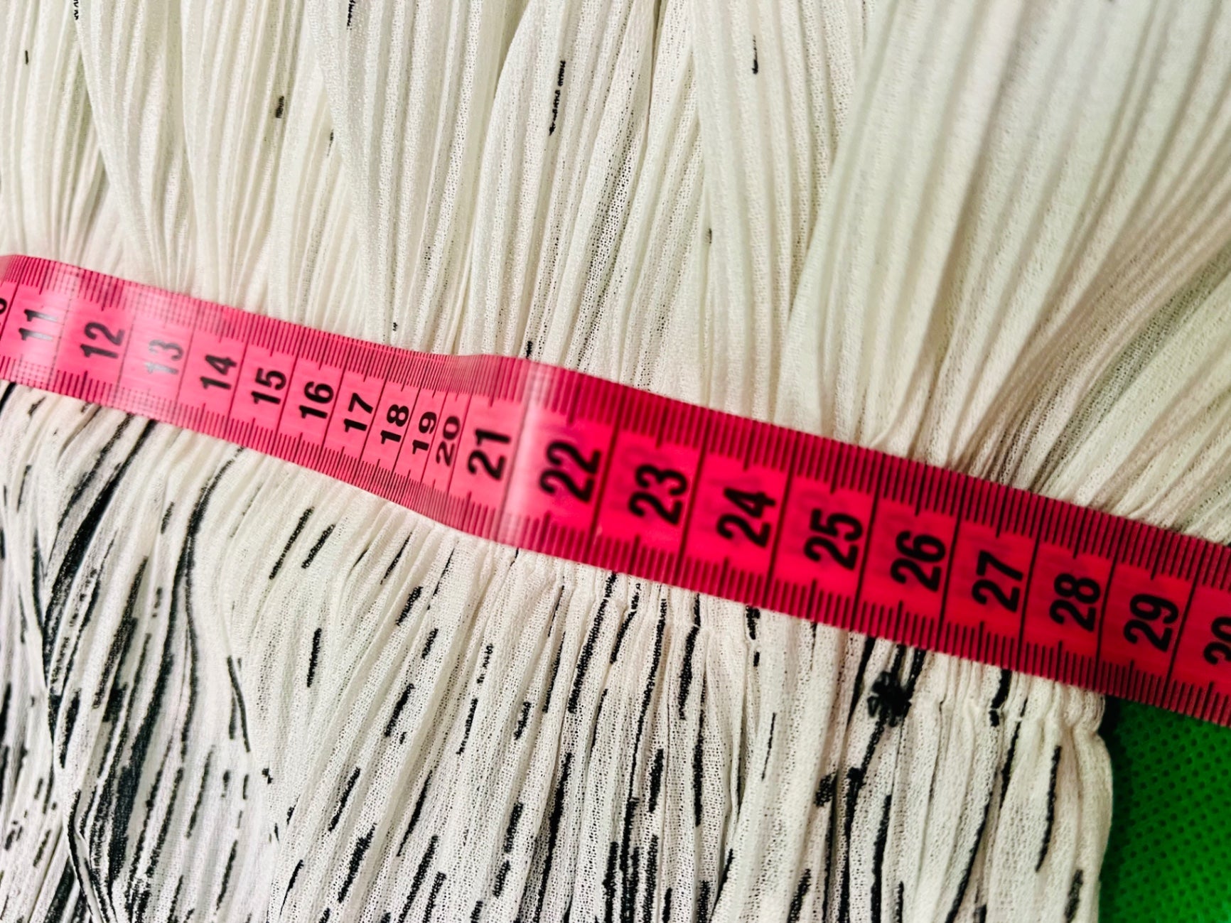 Taillenweite dehnbar von 28 - ca. 53.cm, einfach gemessen. Ich denke es passt am besten Gr 38. Der Stoff fühlt sich sehr gut an, schätze Viskose oder Seide, leider kein Etikett mehr vorhanden. Super hochwertig gearbeitete Falten, sehr guter Zustand.