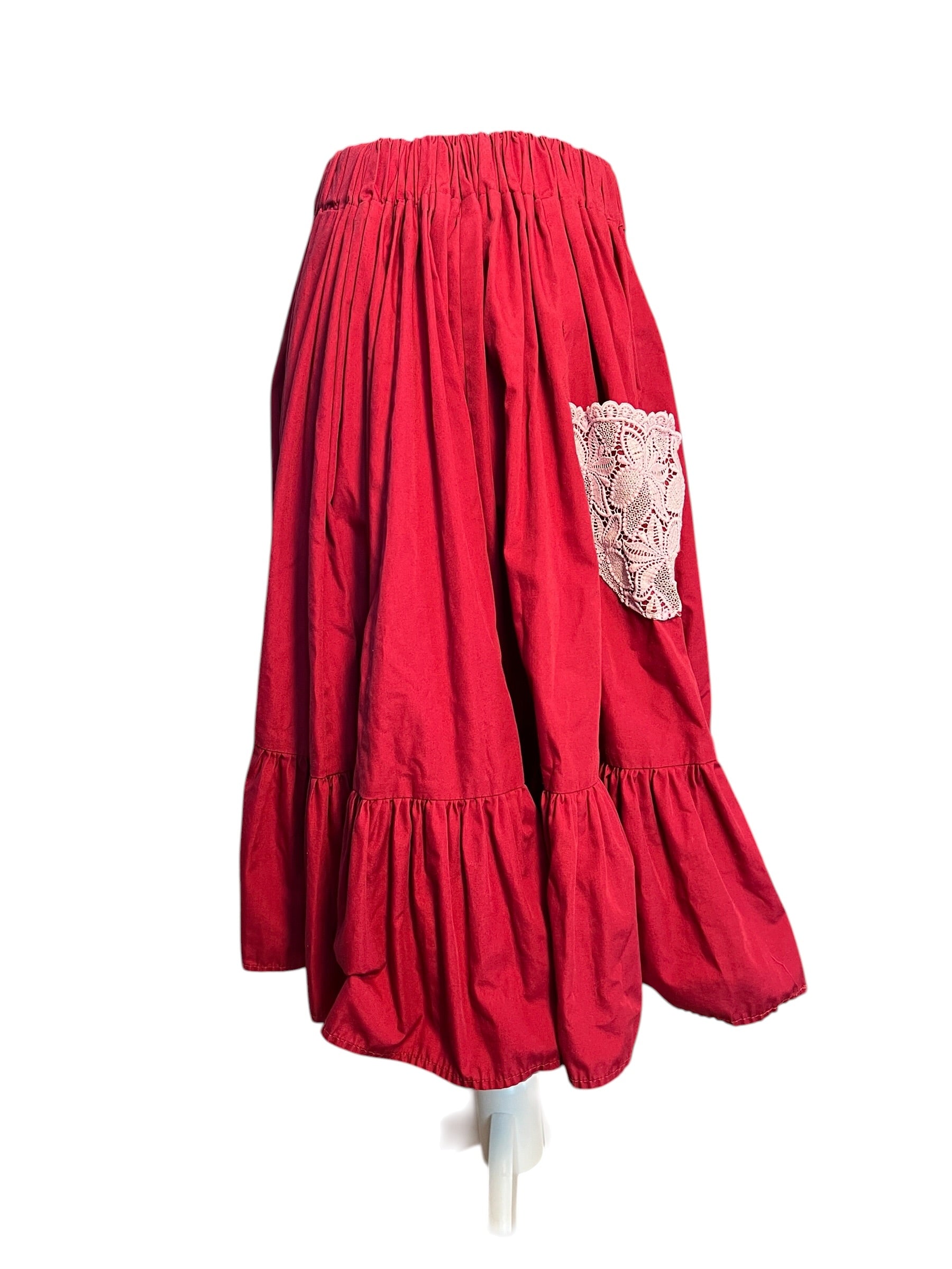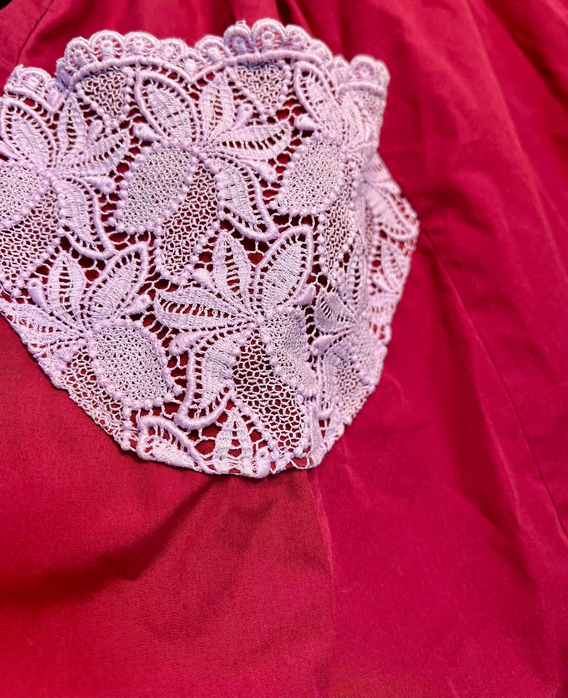 Besonderes Highlight sind die zwei aufgesetzten Fronttaschen aus Spitzenstoff – ein verspielter, femininer Kontrast zum kräftigen Rot.
