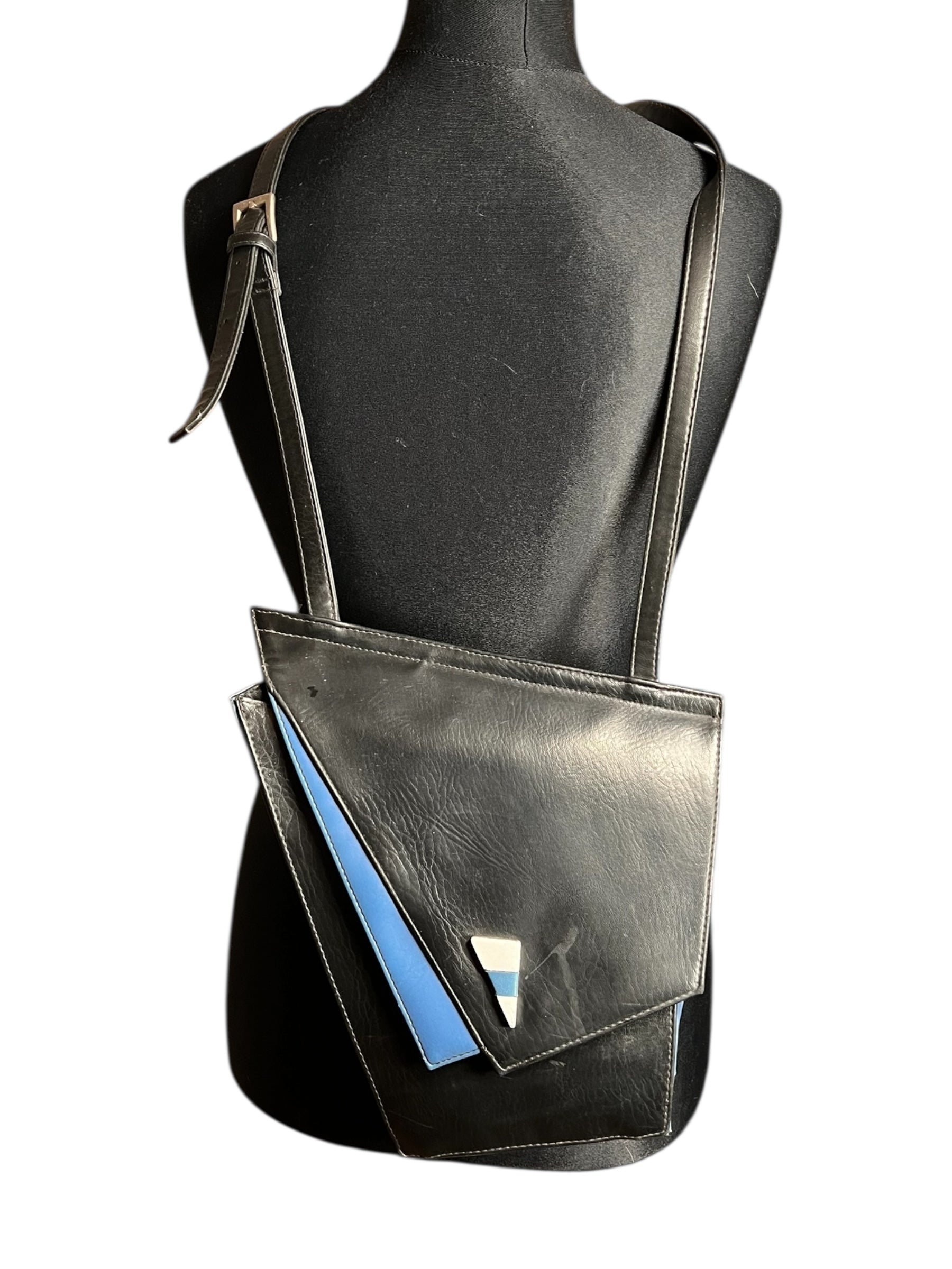 Vintage Leder Umhängetasche 80s – geometrisches Rautendesign – schwarz/blau – Statement Tasche