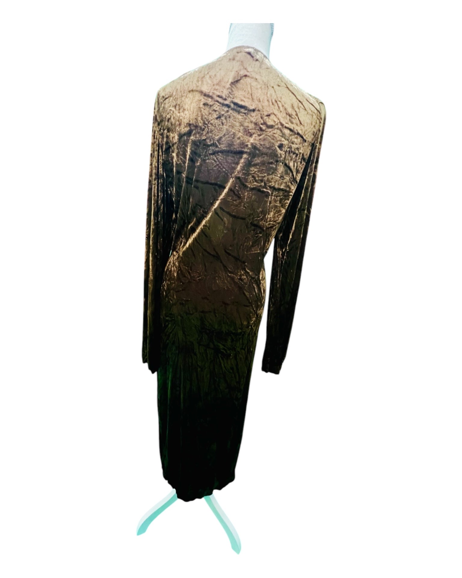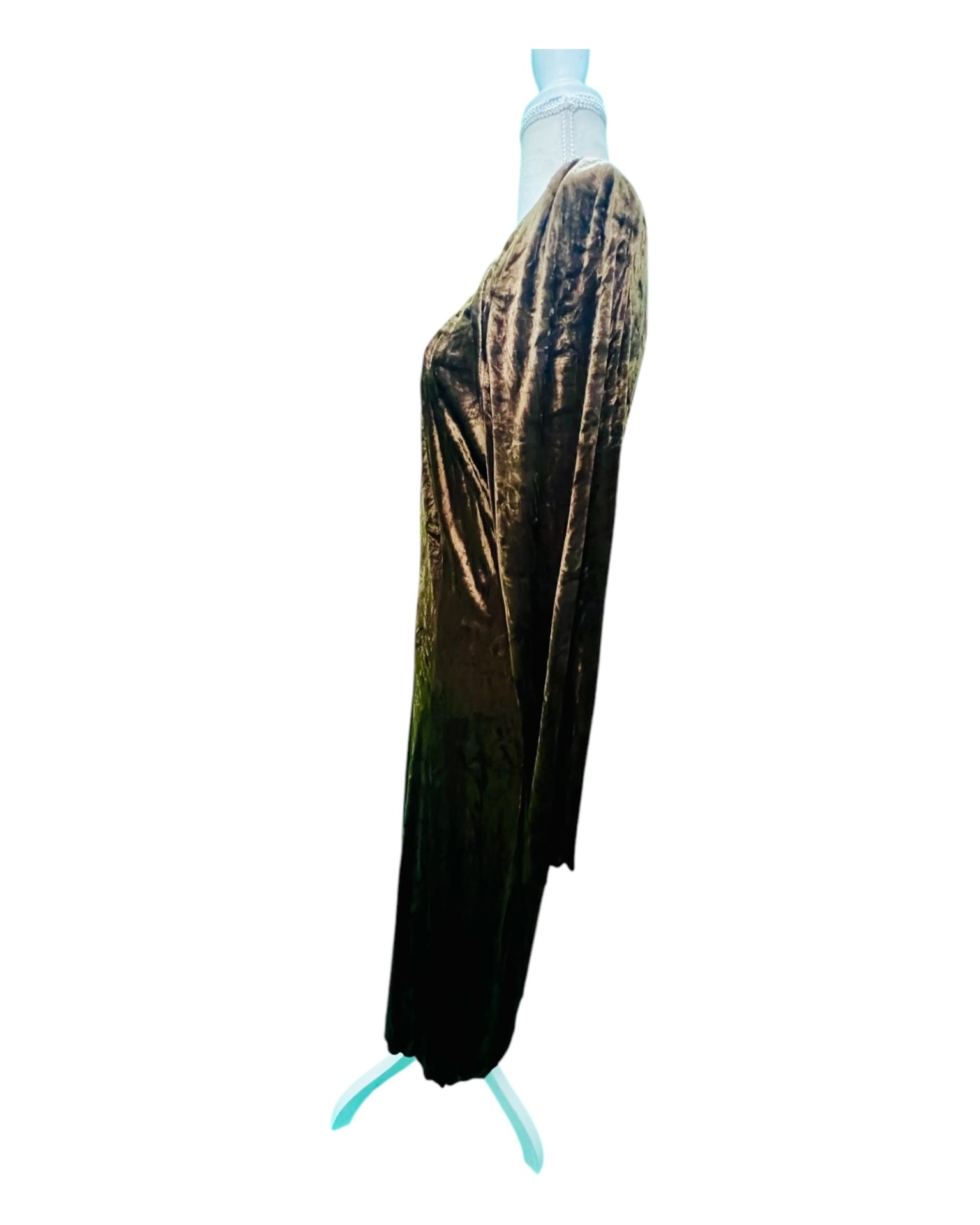 Ein elegantes Vintage Samtkleid von Ghinea, das mit seinem edlen Glanz einen Hauch von Luxus in die Garderobe bringt. Der braune Farbton sorgt für eine warme und stilvolle Ausstrahlung. Perfekt für besondere Anlässe, bei denen du einen bleibenden Eindruck hinterlassen möchtest, ohne auf Komfort zu verzichten. Die langen Ärmel verleihen dem Kleid eine zeitlose Eleganz. Tolle Falten vorne schmeicheln der Figur.