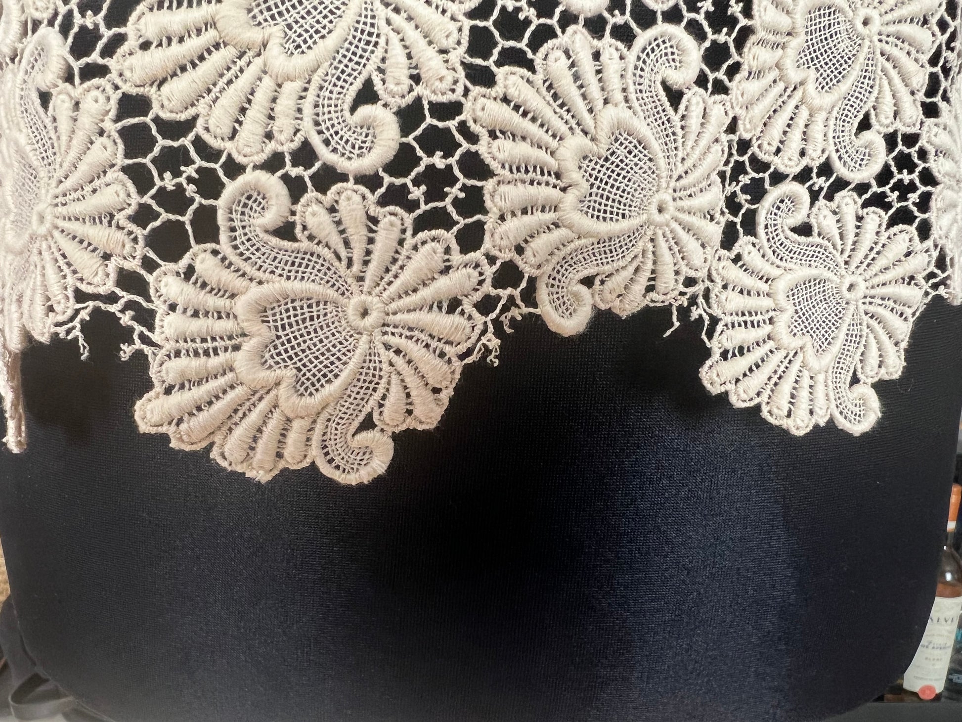 Der Stoff besteht aus hochwertiger, transparenter Spitze mit floralem Muster, der Saum folgt sanft der Struktur des Spitzenstoffs – ein wunderschönes Detail! ✨