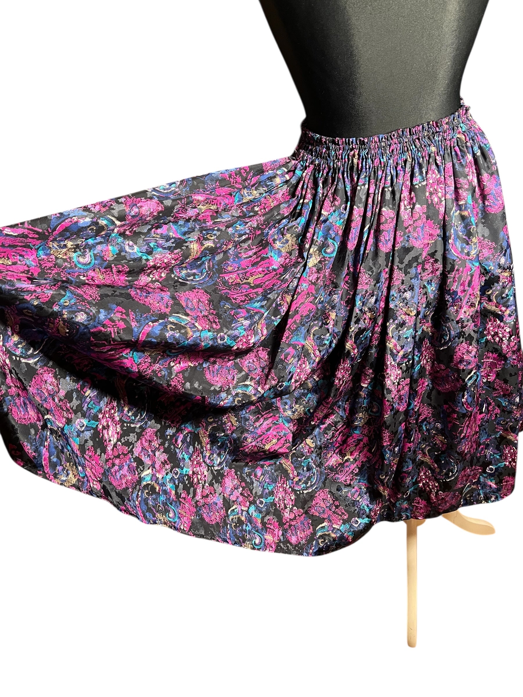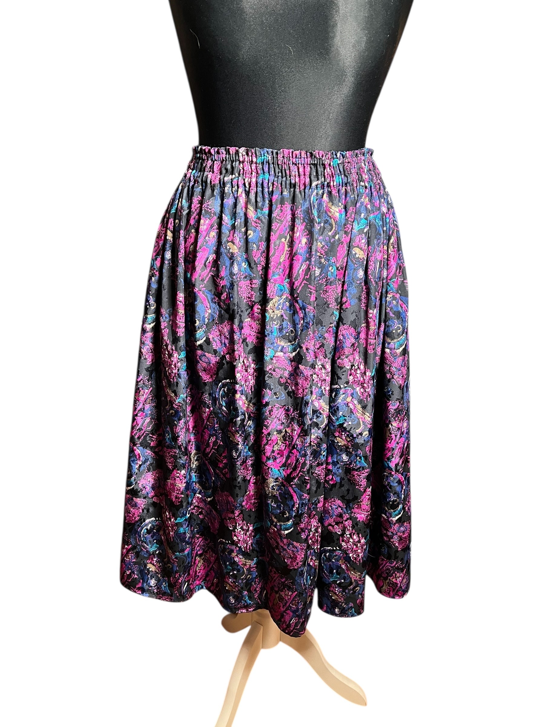 Vintage Tellerrock 80s , Gr 36–42 passend, schwarz pink lila blau bunt gemustert – Midirock schwingend – Statement Rock