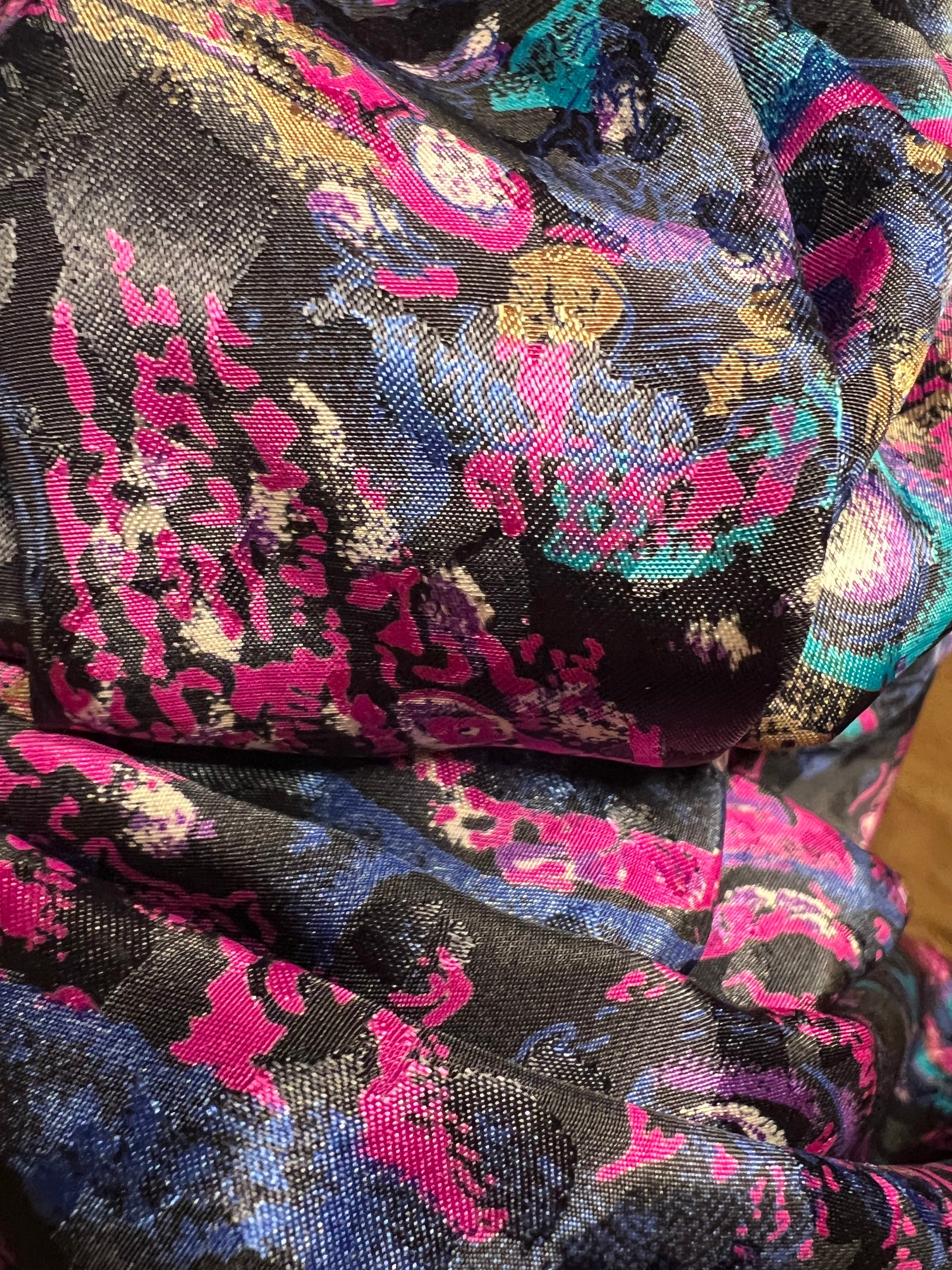 Der leicht glänzende Stoff zeigt ein intensives, abstraktes Muster in Blau, Lila und Pink auf schwarzem Grund – ein echtes Statement-Piece mit typischem 80s-Vibe.