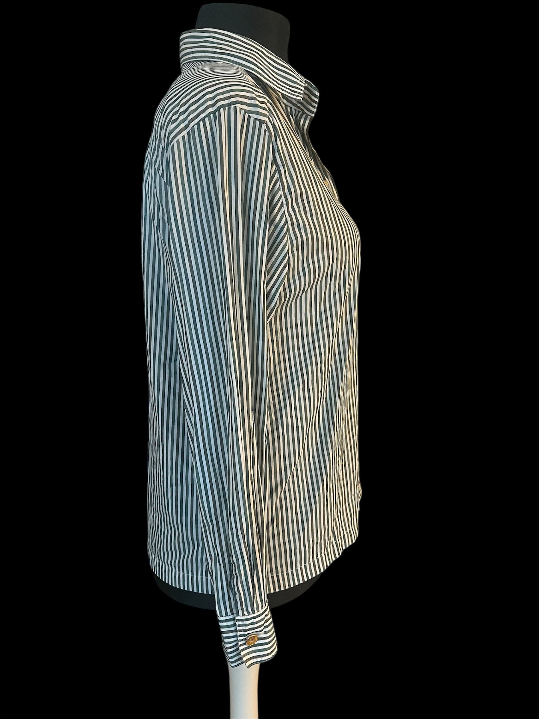 Die Bluse besteht aus hochwertiger Baumwolle, ist weißgrundig und hat feine Streifen in zwei kühlen Grüntönen – perfekt für den aktuellen Quiet Luxury & Old Money Trend.