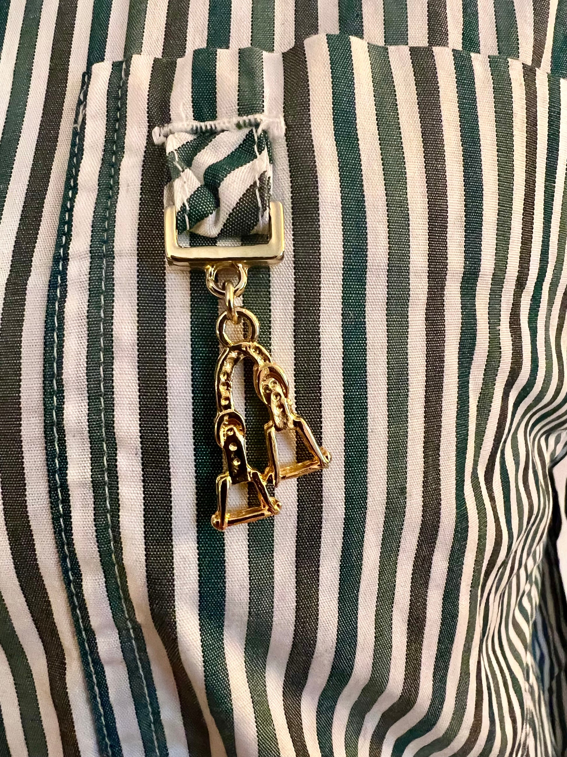 Besonders edel wirken die hochwertigen goldenen Knöpfe mit Prägung. Ein Highlight ist die Brusttasche, an der ein goldener Anhänger mit zwei kleinen Glocken befestigt ist – ein echtes Vintage-Detail!