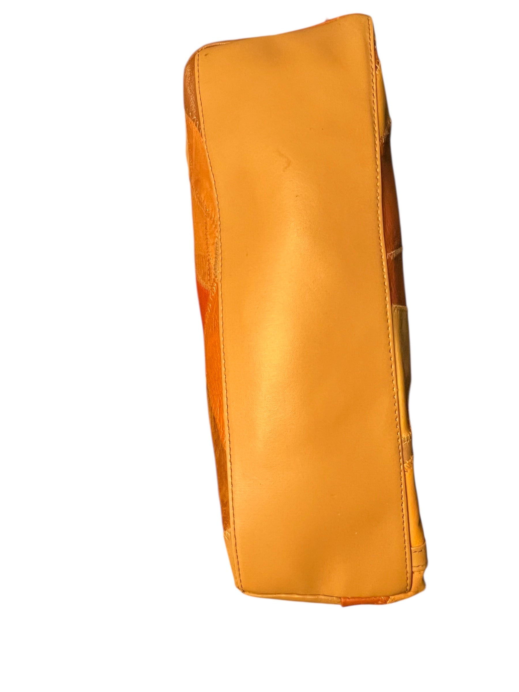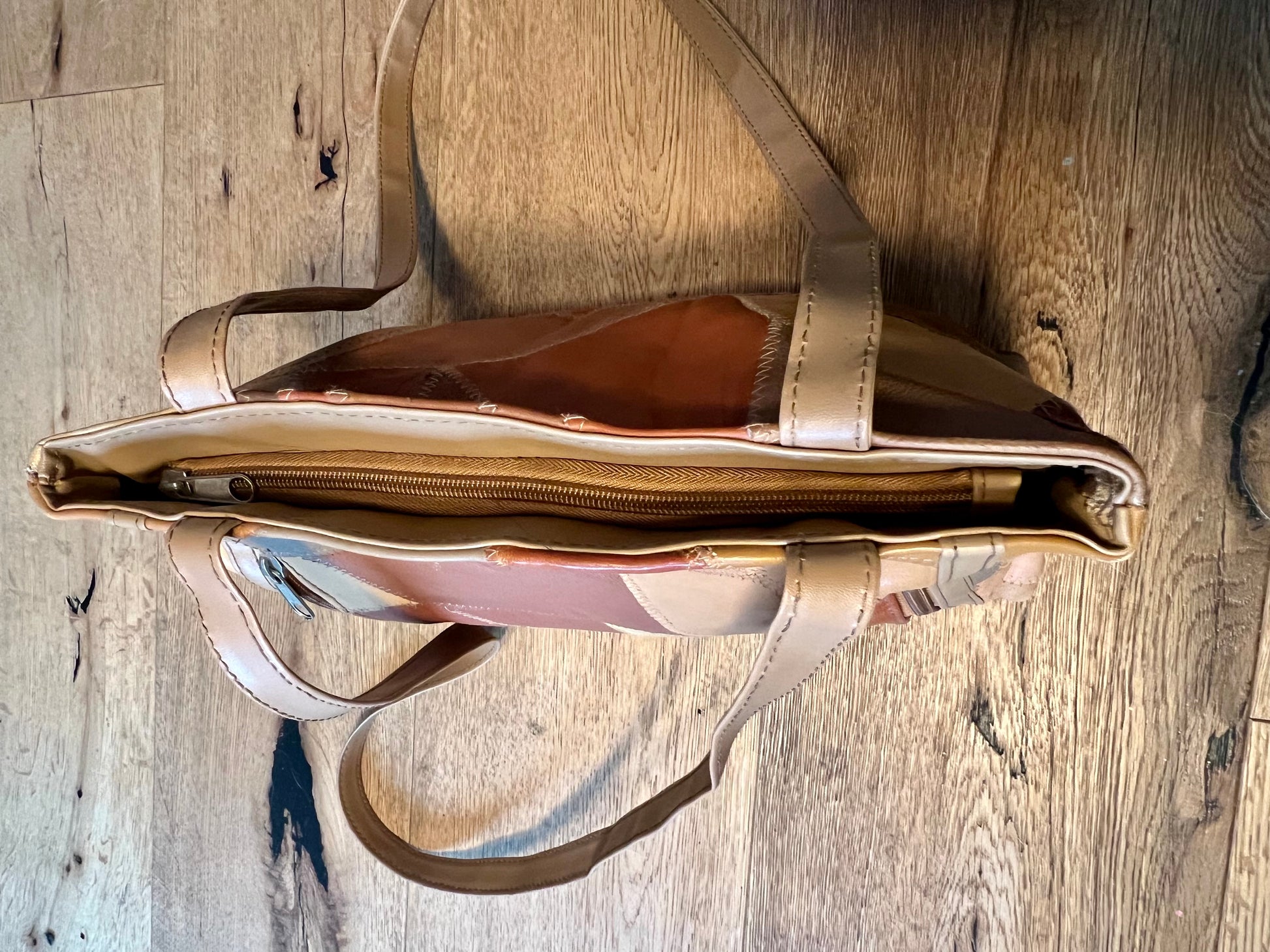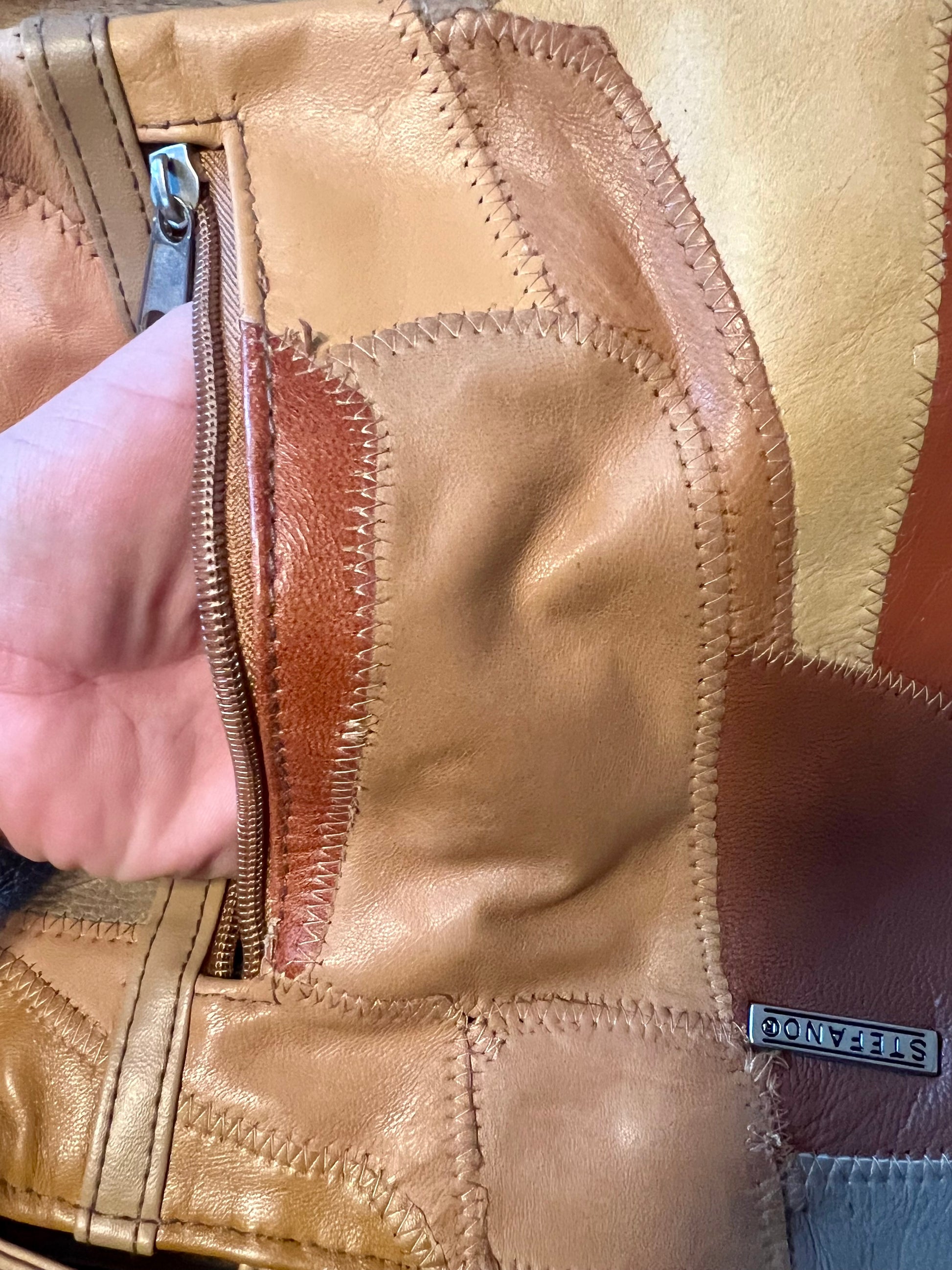 Vintage Patchwork Schultertasche der Marke Stefano in verschiedenen Braun- & Beigetönen, wie ein Flickenteppich vernäht – sehr lässig & zeitlos.