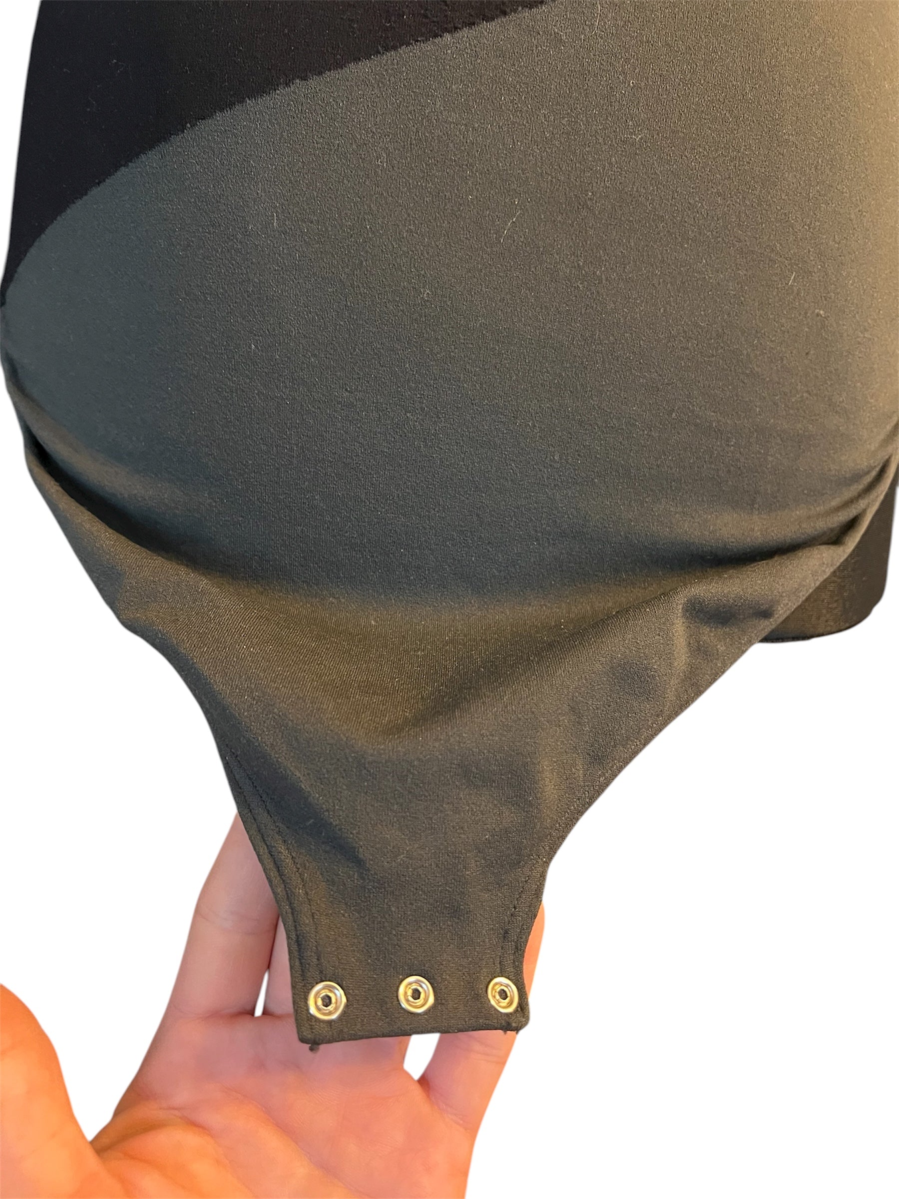 Farbe: Schwarz mit grau-grafischem Einsatz, super edel & stylisch. Materialmix aus Polyamid & Elastan – angenehm stretchig, weich & figurbetont. Mit kleinem Stehkragen und Druckknöpfen im Schritt für maximalen Komfort.